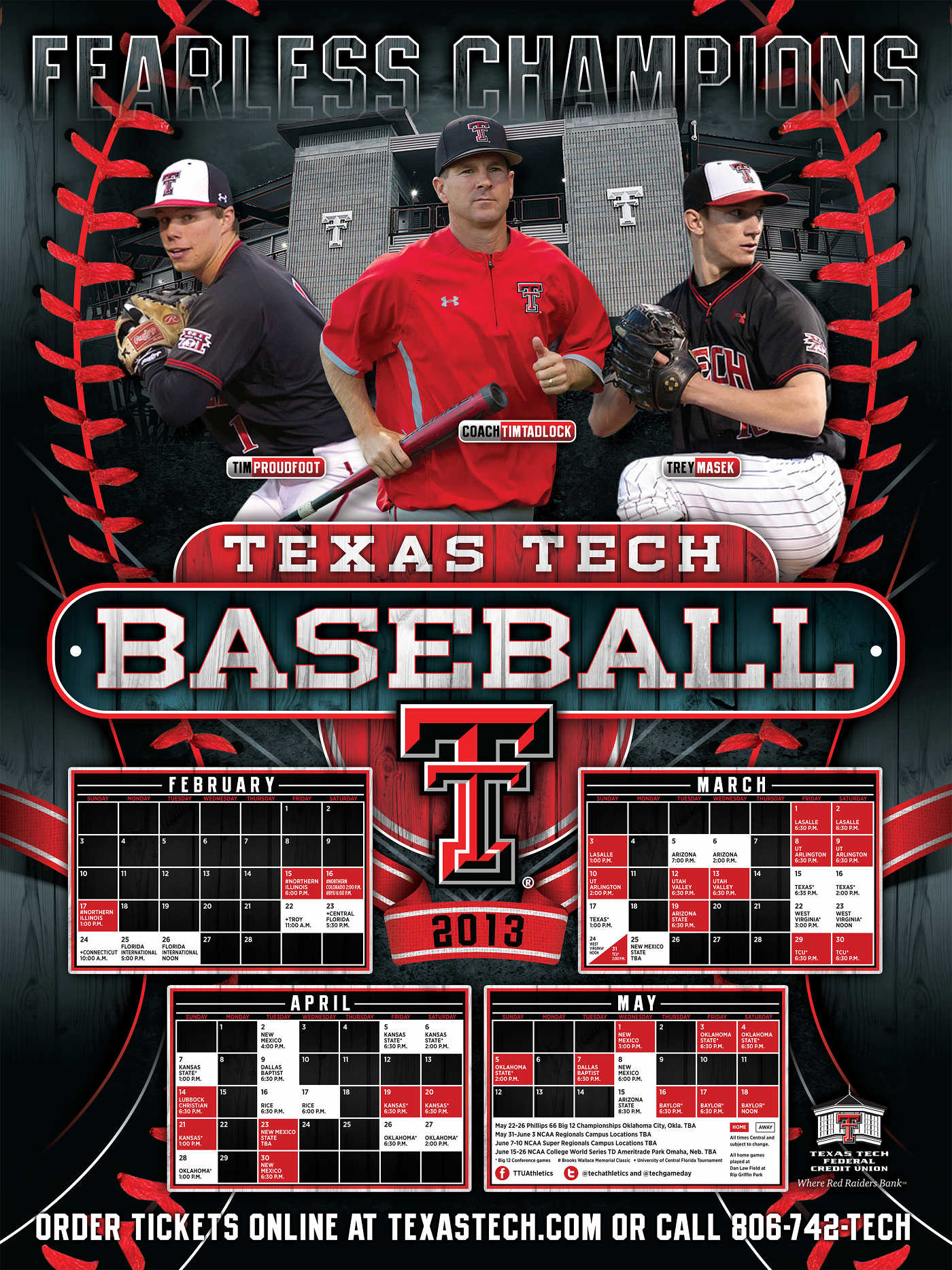 As we continue to countdown to the first pitch of the 2013 season, we are running some of the best posters from schools across the country. The team we feature today is the Texas Tech Red Raiders. They enter the season coming off a 2012 season which saw them go 29-26 overall and 7-17 in Big 12 play. This will be the first year for the Red Raiders under Tim Tadlock who takes over the program from Dan Spencer. You can check out the poster below which features head coach Tim Tadlock, Tim Proudfoot and Trey Masek. You can send future posters to us by clicking here.