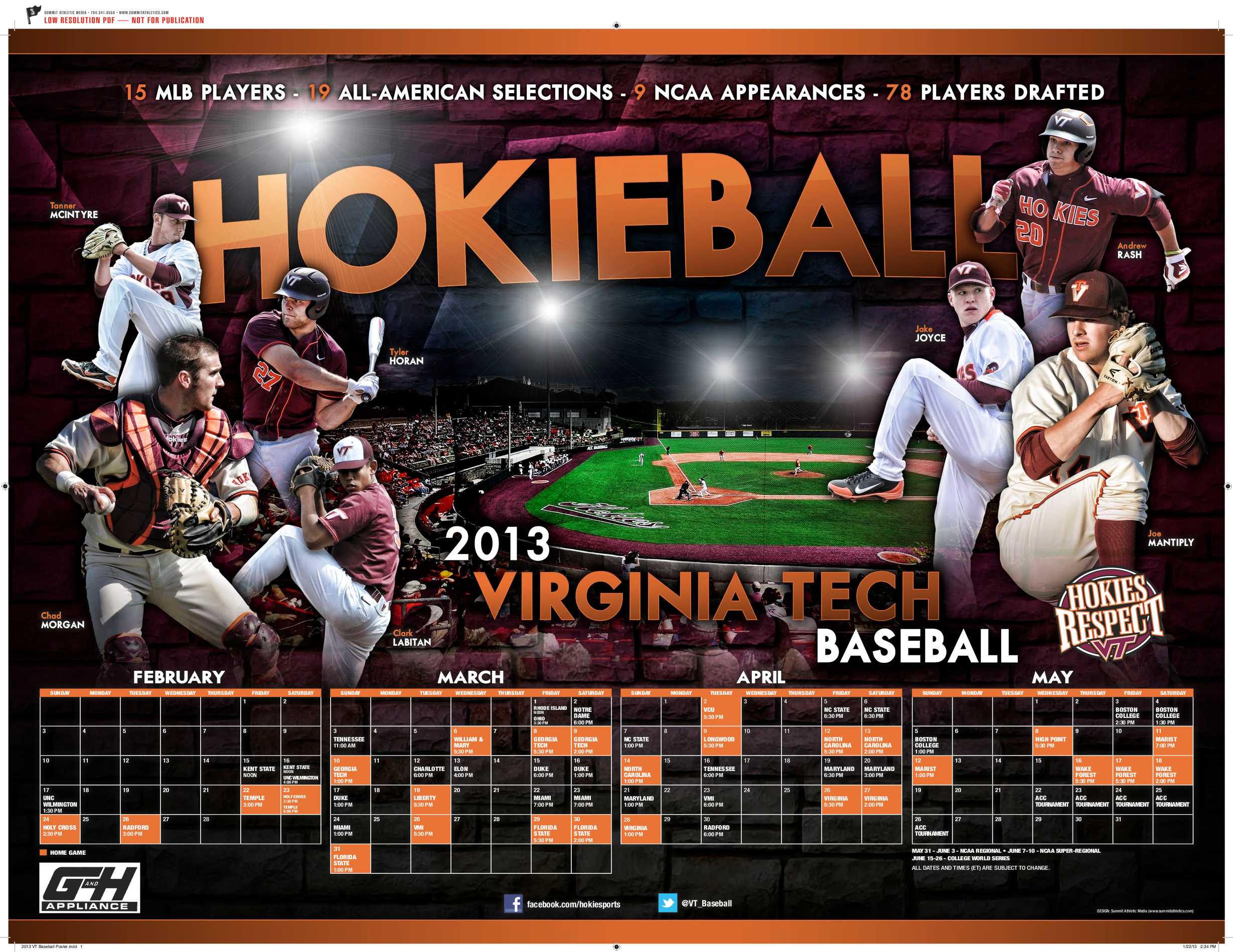 As we continue counting down to the first pitch of the 2013 season, we are running some of the best posters from schools across the country. The team we feature today is the Virginia Tech Hokies. They are coming off a season which saw them go 34-21 last season with an 11-19 record in the ACC play. You can check out the poster below. Future posters can be sent to me by clicking here.