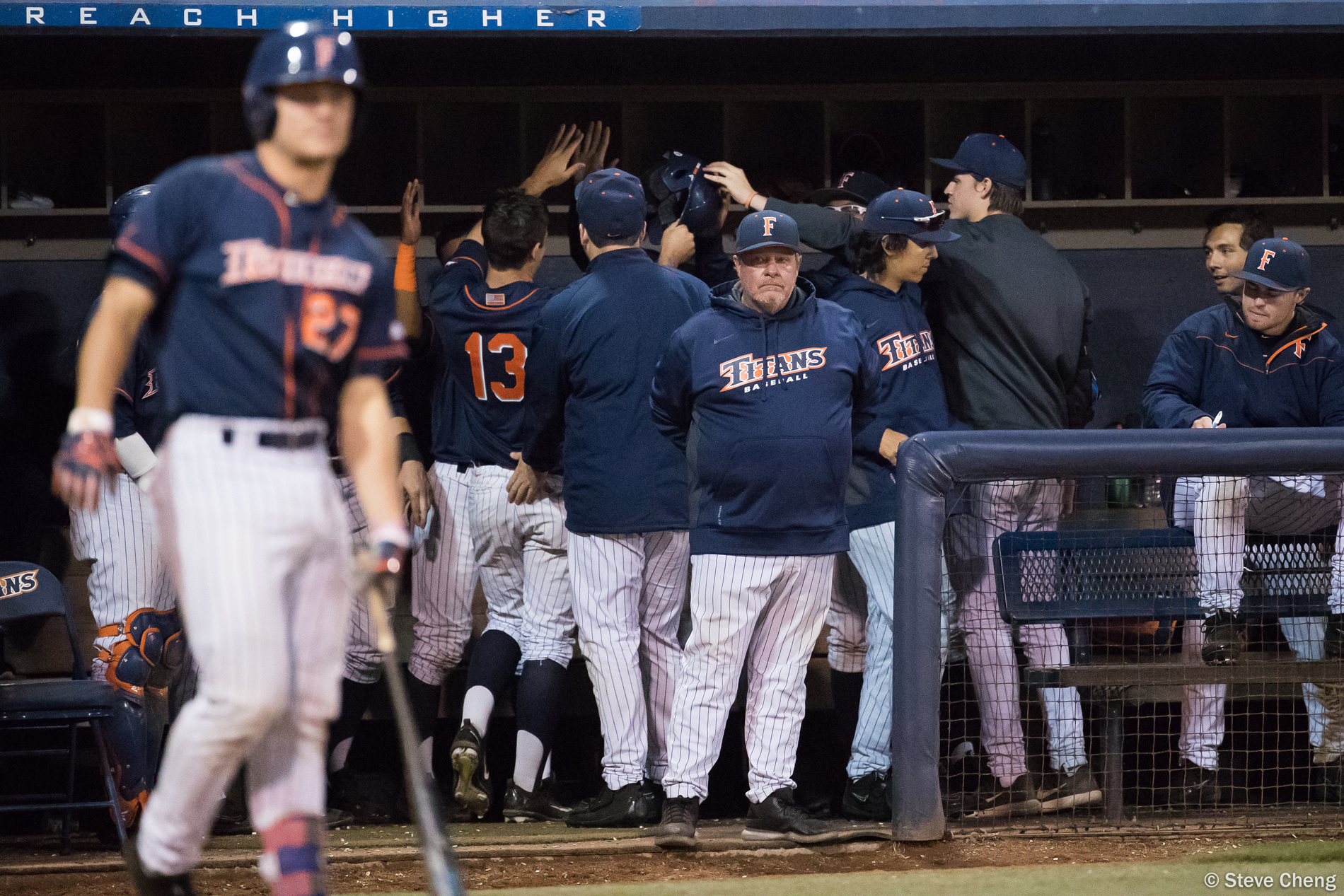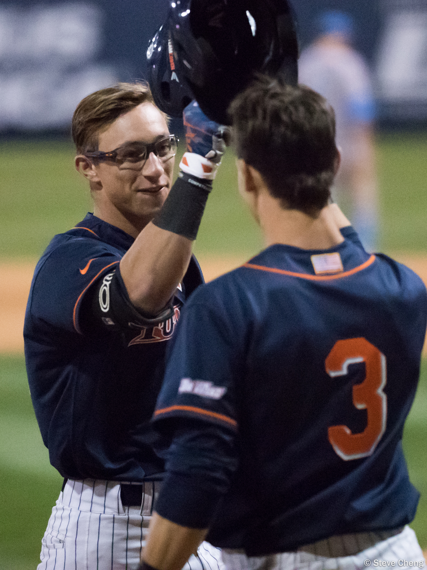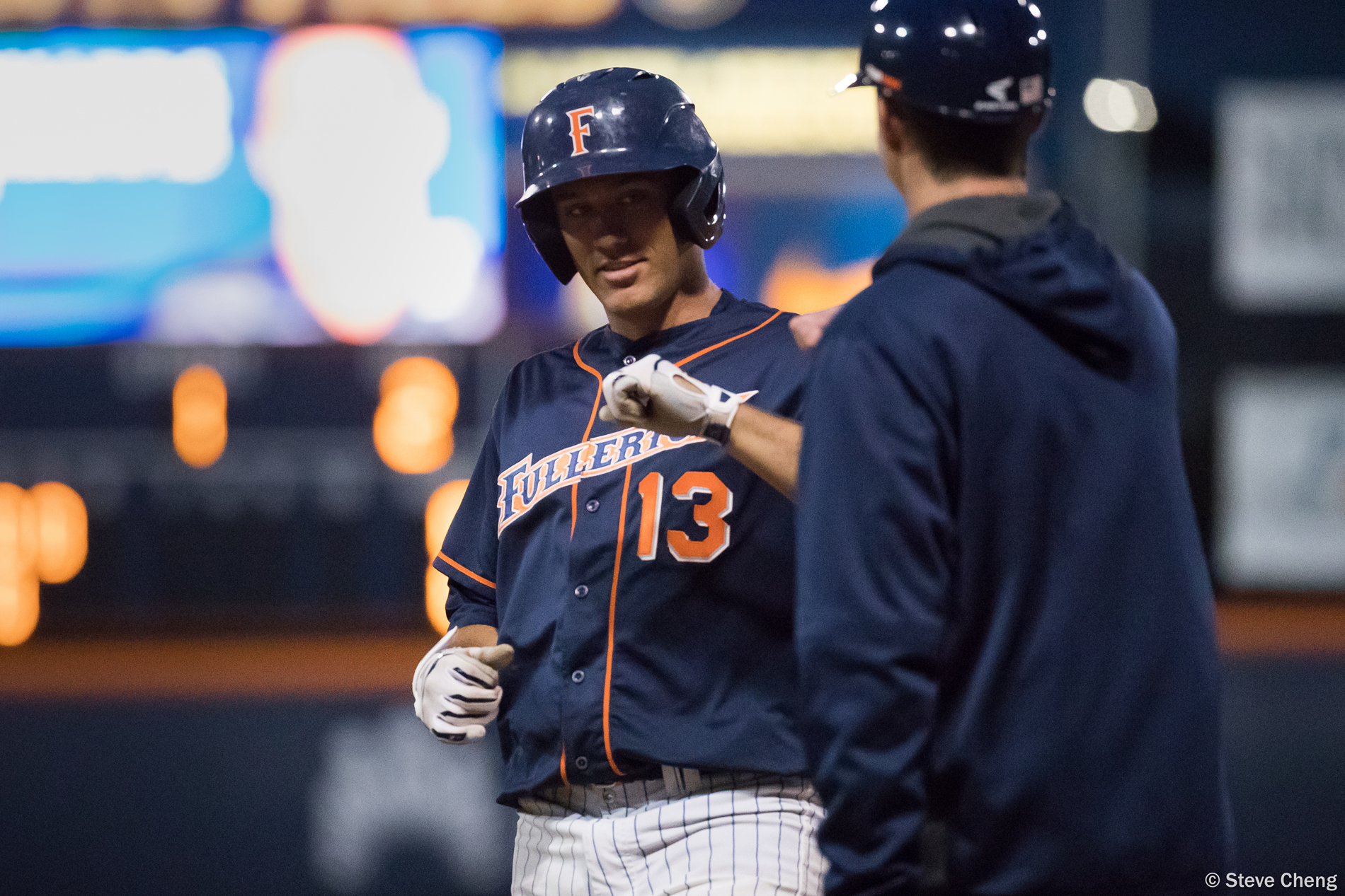 Jack Stronach congratules Michael Toglia after Toglia scored in the 8th inning. CSUF defeated UCLA 4-3, Fullerton, CA, May 9, 2017. Photo by Steve Cheng, BHEphotos.