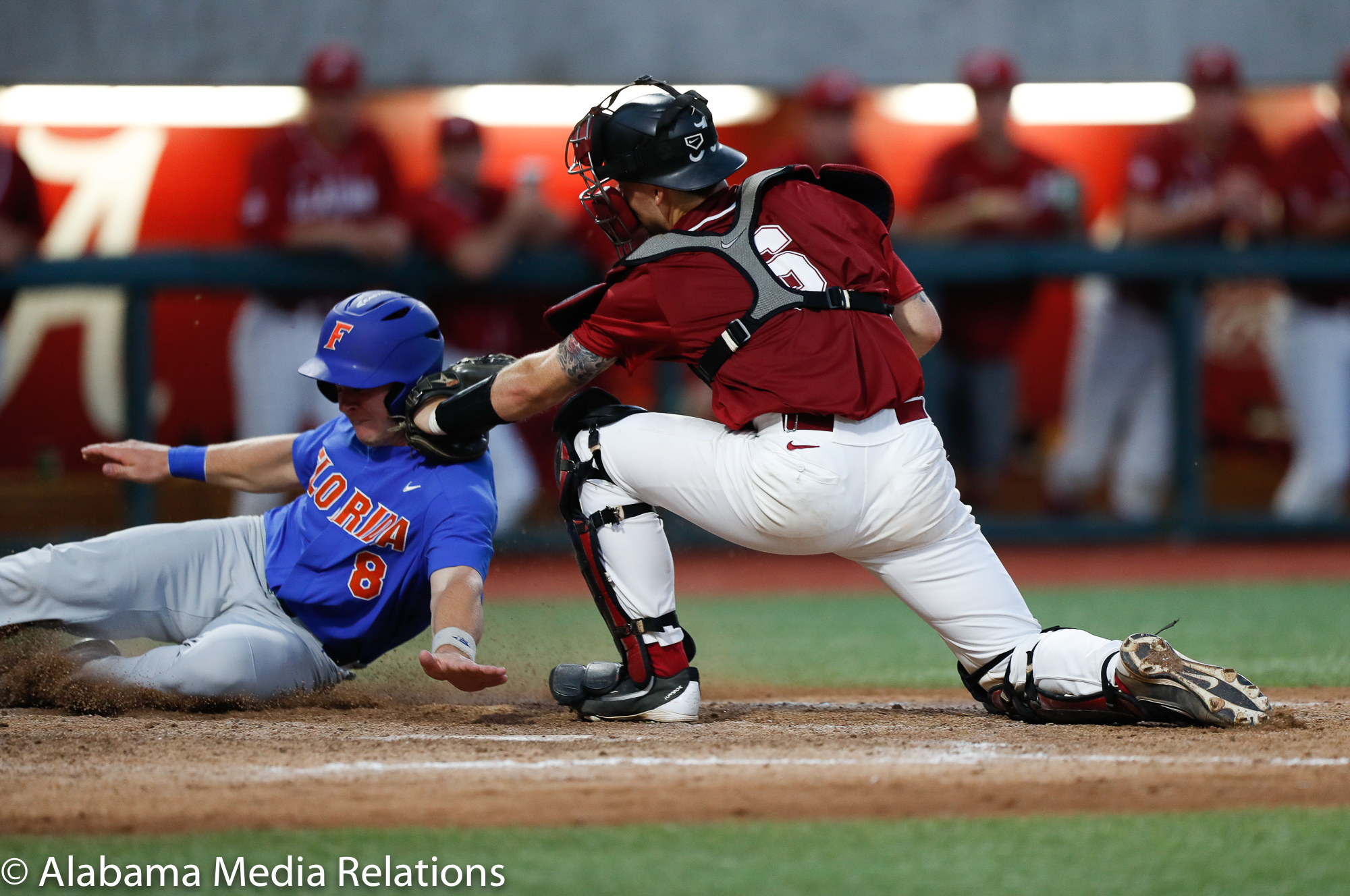 Florida used a two-out rally in the fifth to extend the lead to 6-3. A walk with two down followed by a single placed runners on the corners. A double in the next at-bat scored one for the Gators, but Alabama limited the damage, cutting the runner down at the plate on a relay from left field to end the inning.