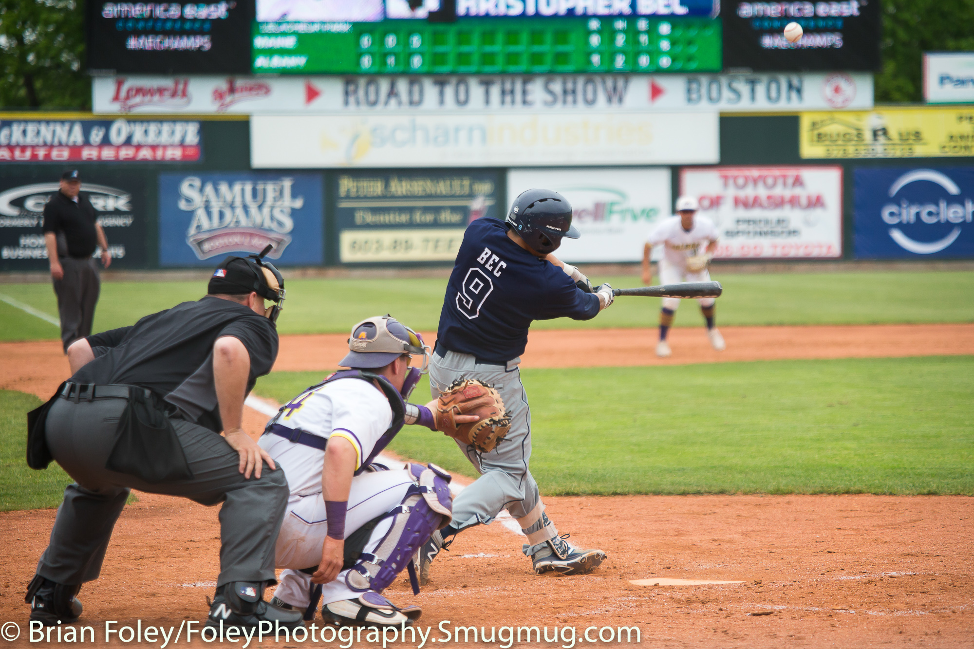 Friday, May 19, 2017; Lowell, MA; Maine Black Bears Christopher Bec (9) at the plate between the Maine Black Bears and Albany Great Danes in the America East tournament.