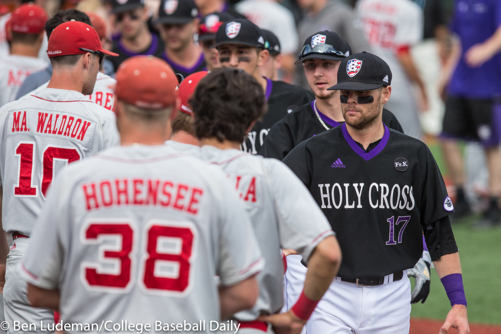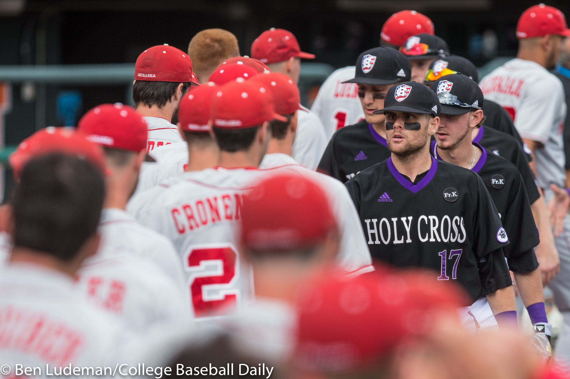 Corvallis, OR – JUNE 3: The teams shake hands after a 7-4 Holy Cross Crusaders victory over the Nebraska Cornhuskers in an NCAA Championship Regional Playoff game on June 3, 2017 at Goss Stadium on the campus of Oregon State University in Corvallis, OR. Today’s loss eliminated the Cornhuskers from the NCAA tournament. (Photo by Ben Ludeman)