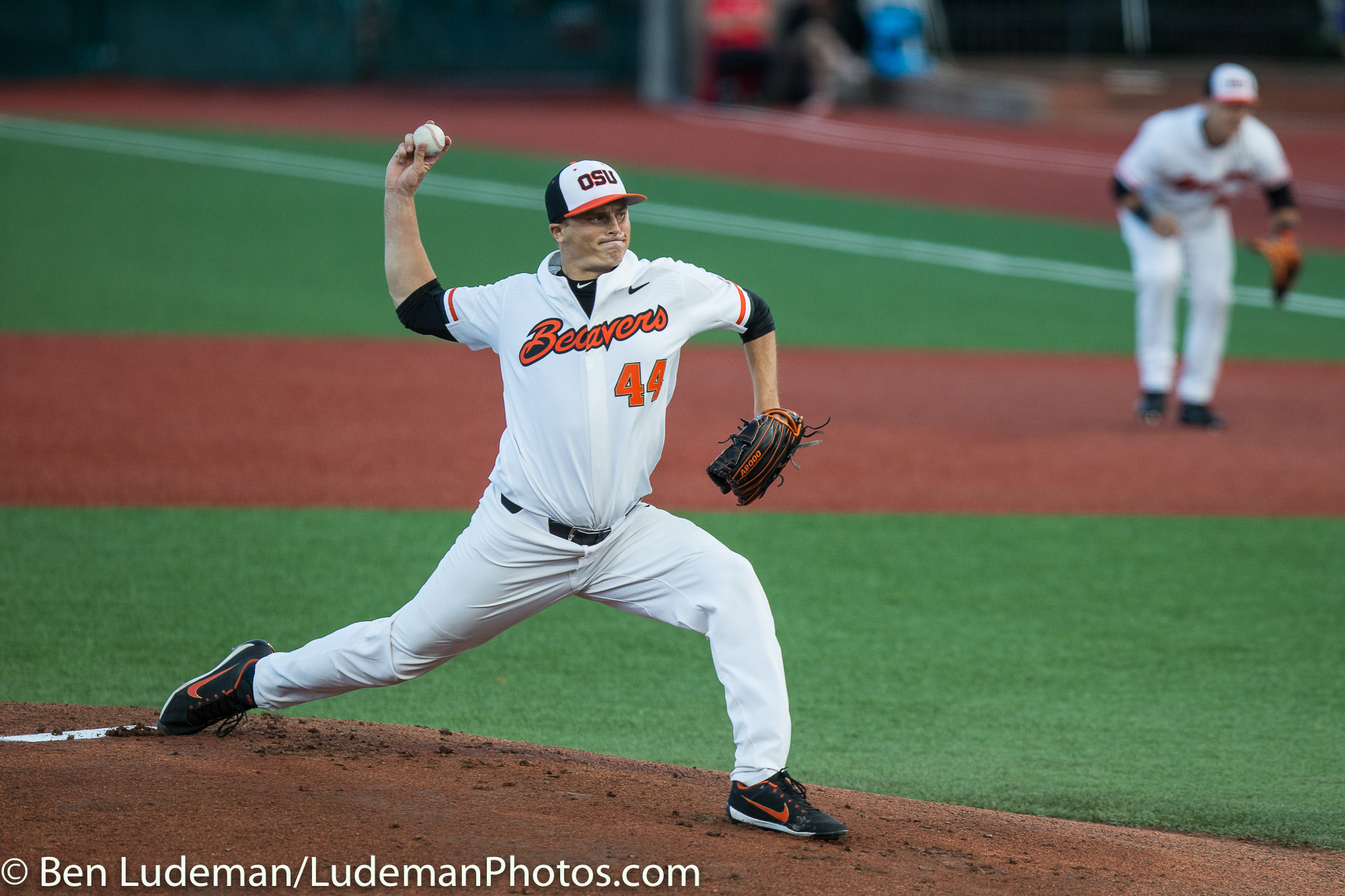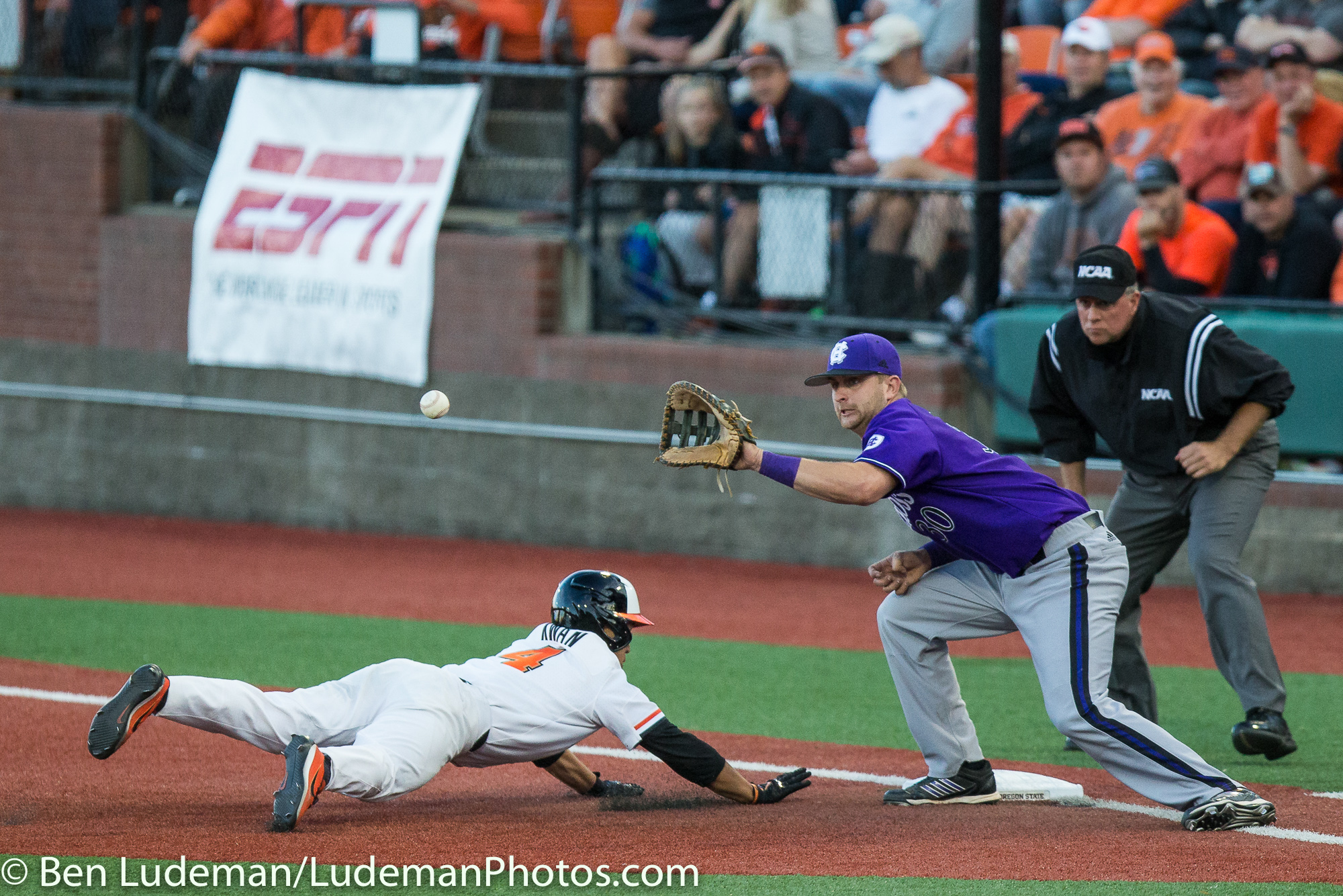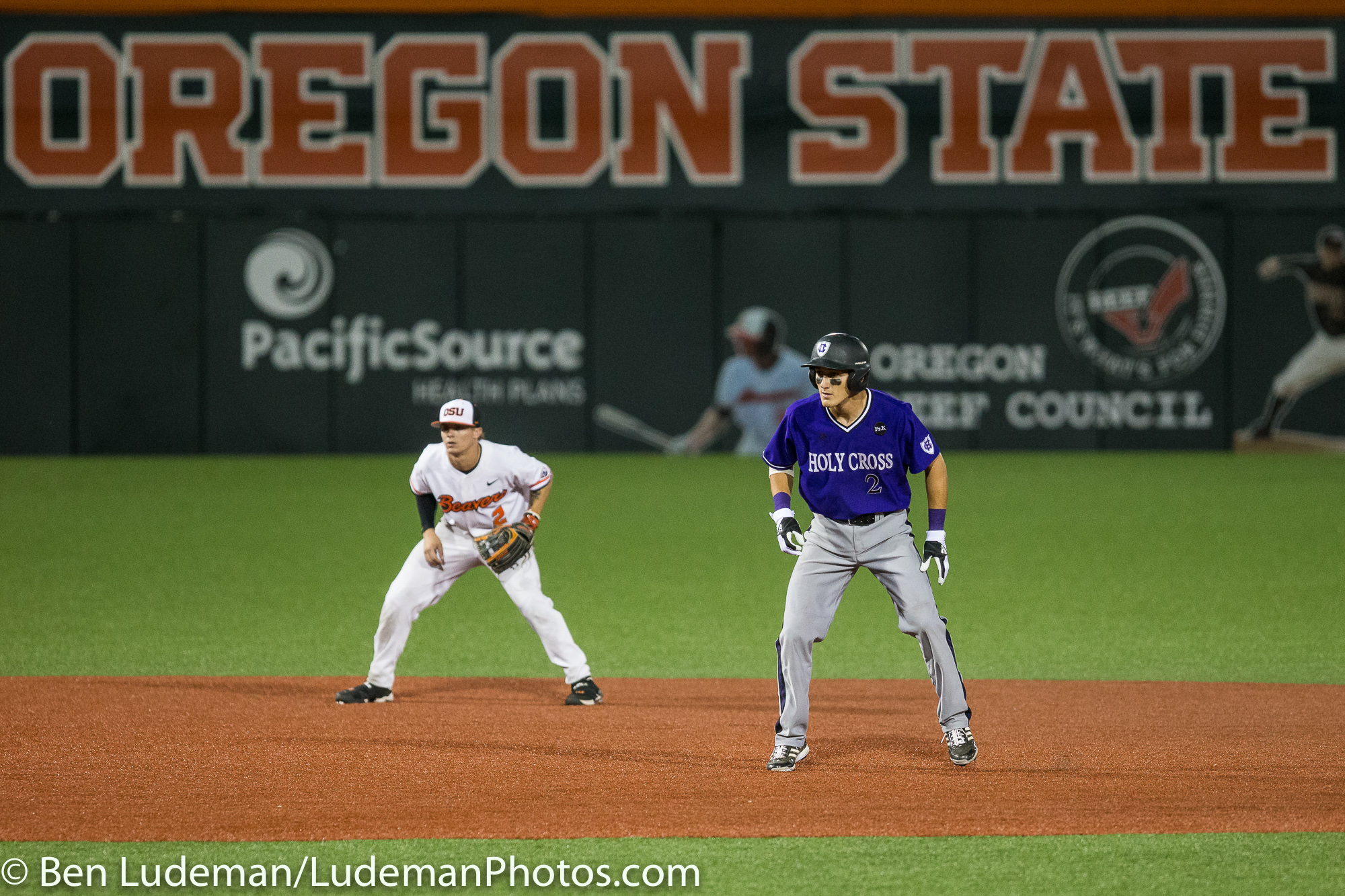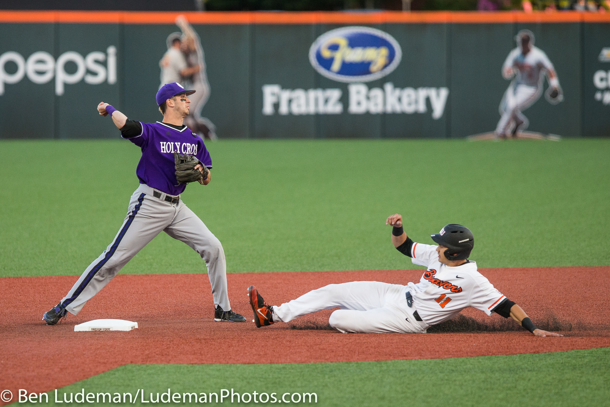 6/2/17, Goss Stadium Corvallis, OR: Holy Cross infielder Chris Rinaldi (2) looks to turn a double play with Oregon State Beavers outfielder Trevor Larnach (11) sliding in during the Oregon State Beavers 8-2 victory over the Holy Cross Crusaders in the 2017 NCAA Baseball Tournament.