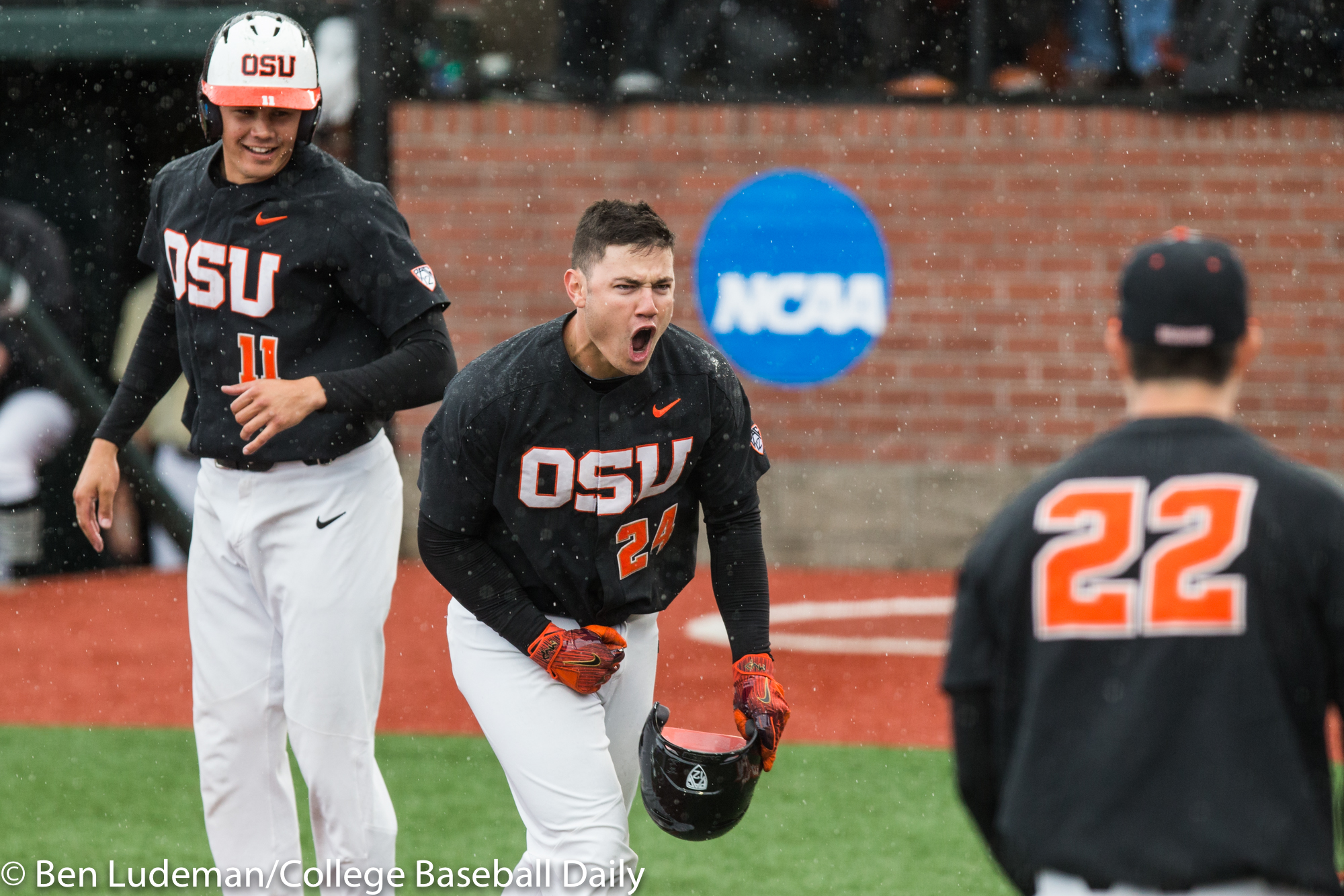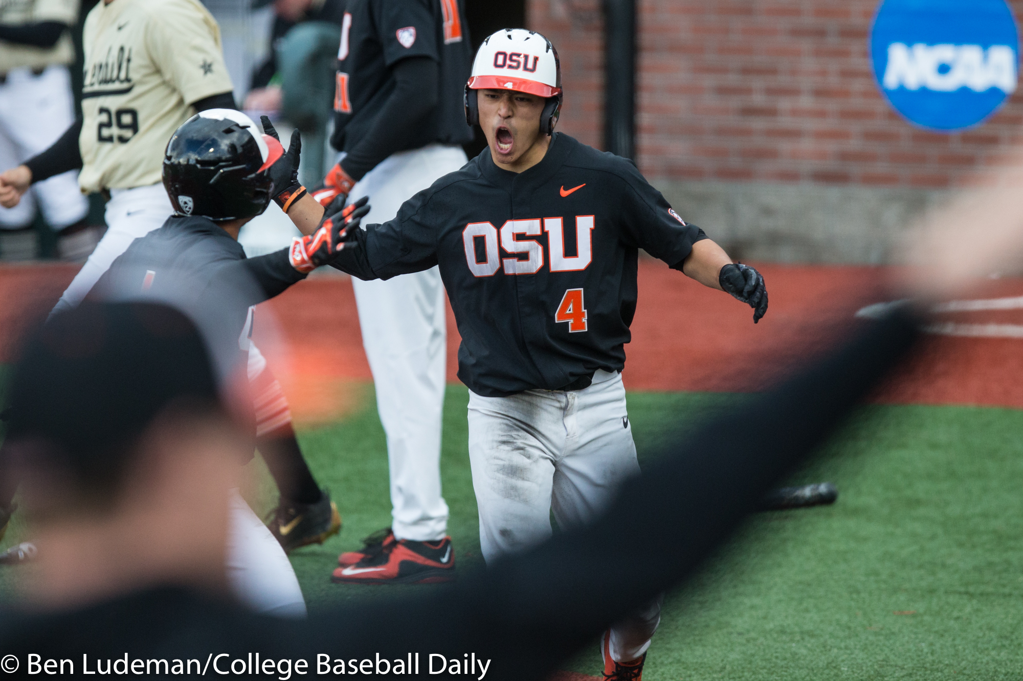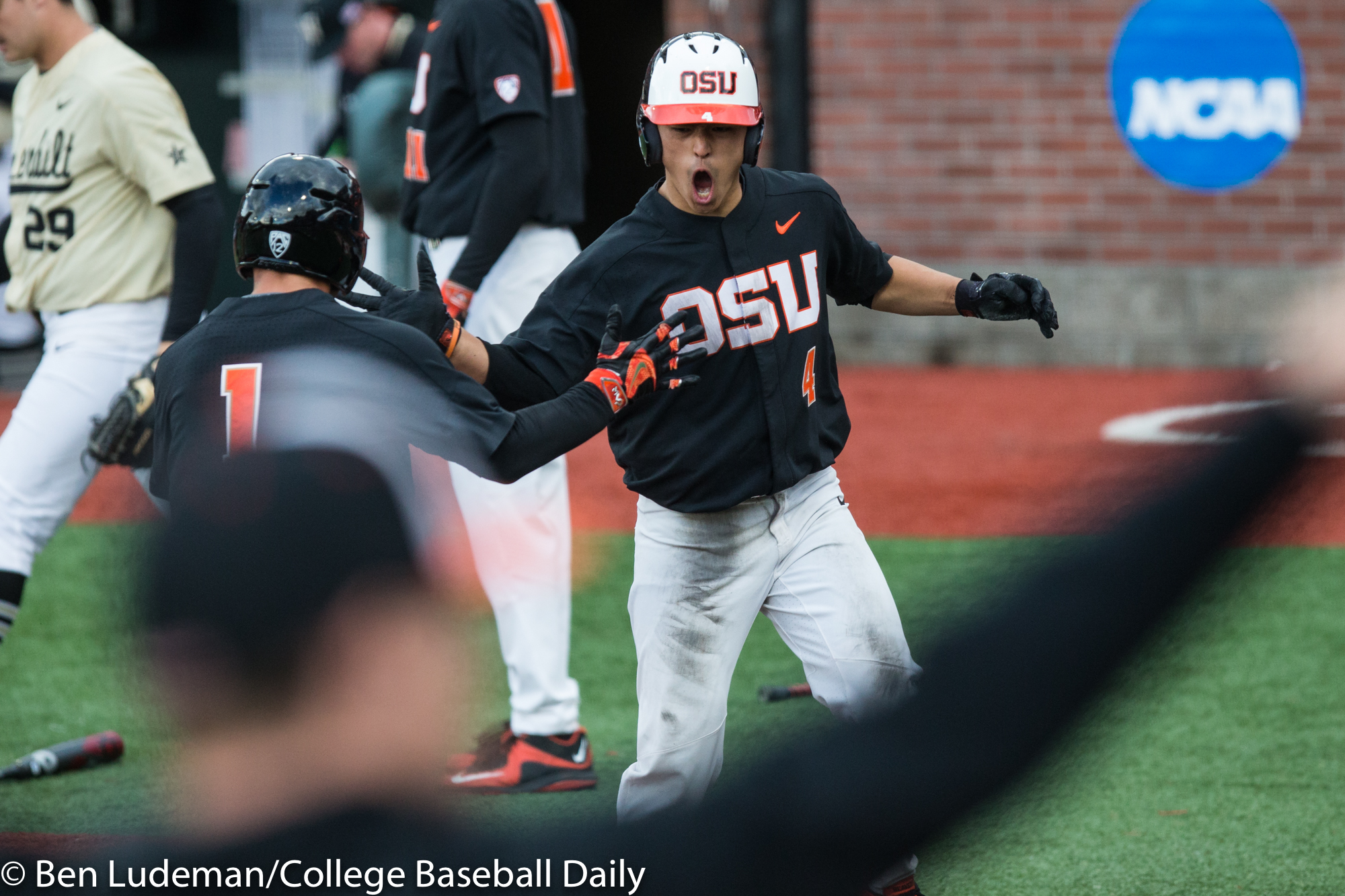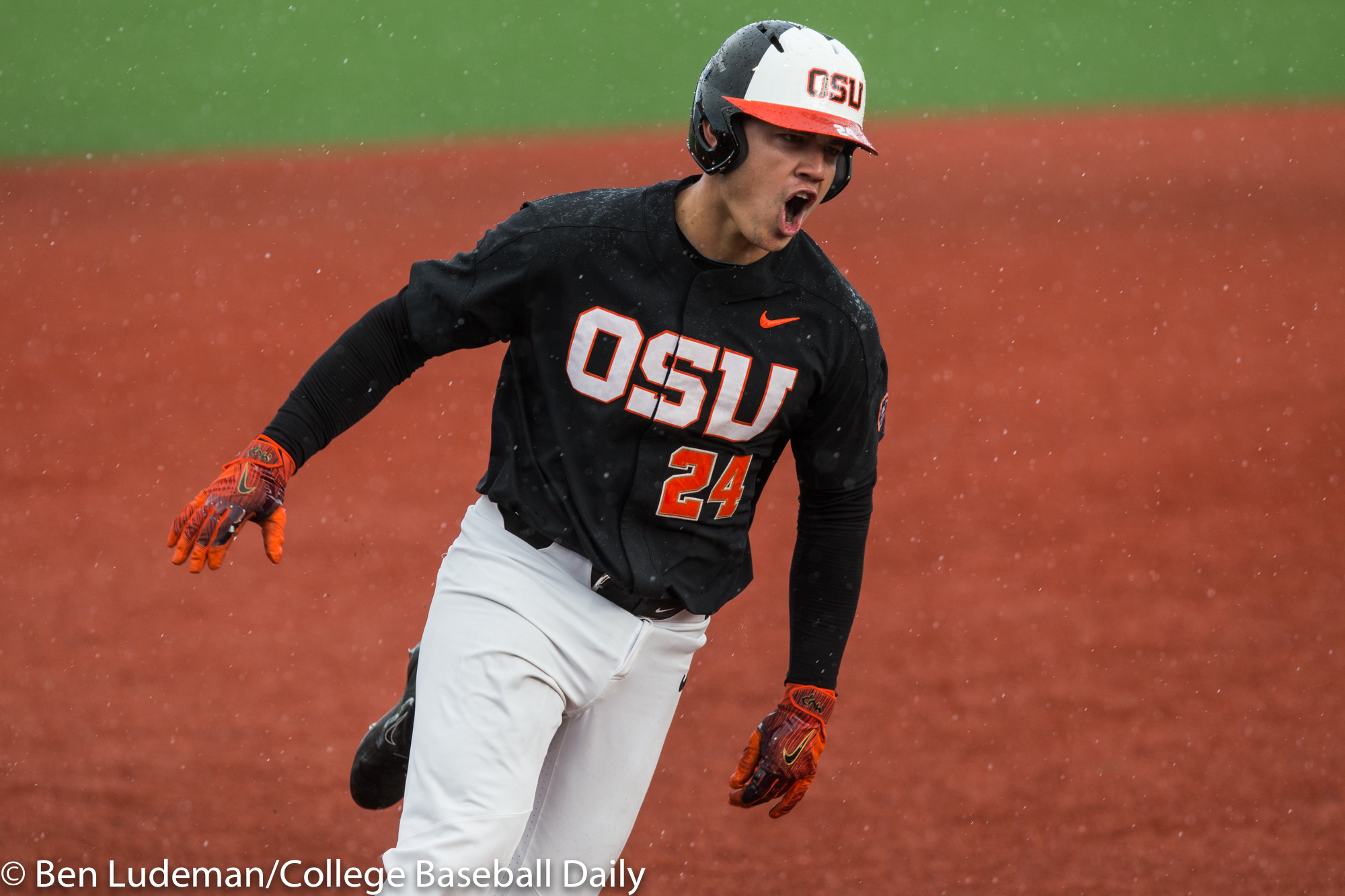 Corvallis, OR – JUNE 9: KJ Harrison (24) of the Oregon State Beavers celebrates a homerun during an 8-4 Oregon State Beavers victory over the Vanderbilt Commodores in an NCAA Championship Super Regional Playoff game on June 9, 2017 at Goss Stadium on the campus of Oregon State University in Corvallis, OR (Photo by Ben Ludeman)