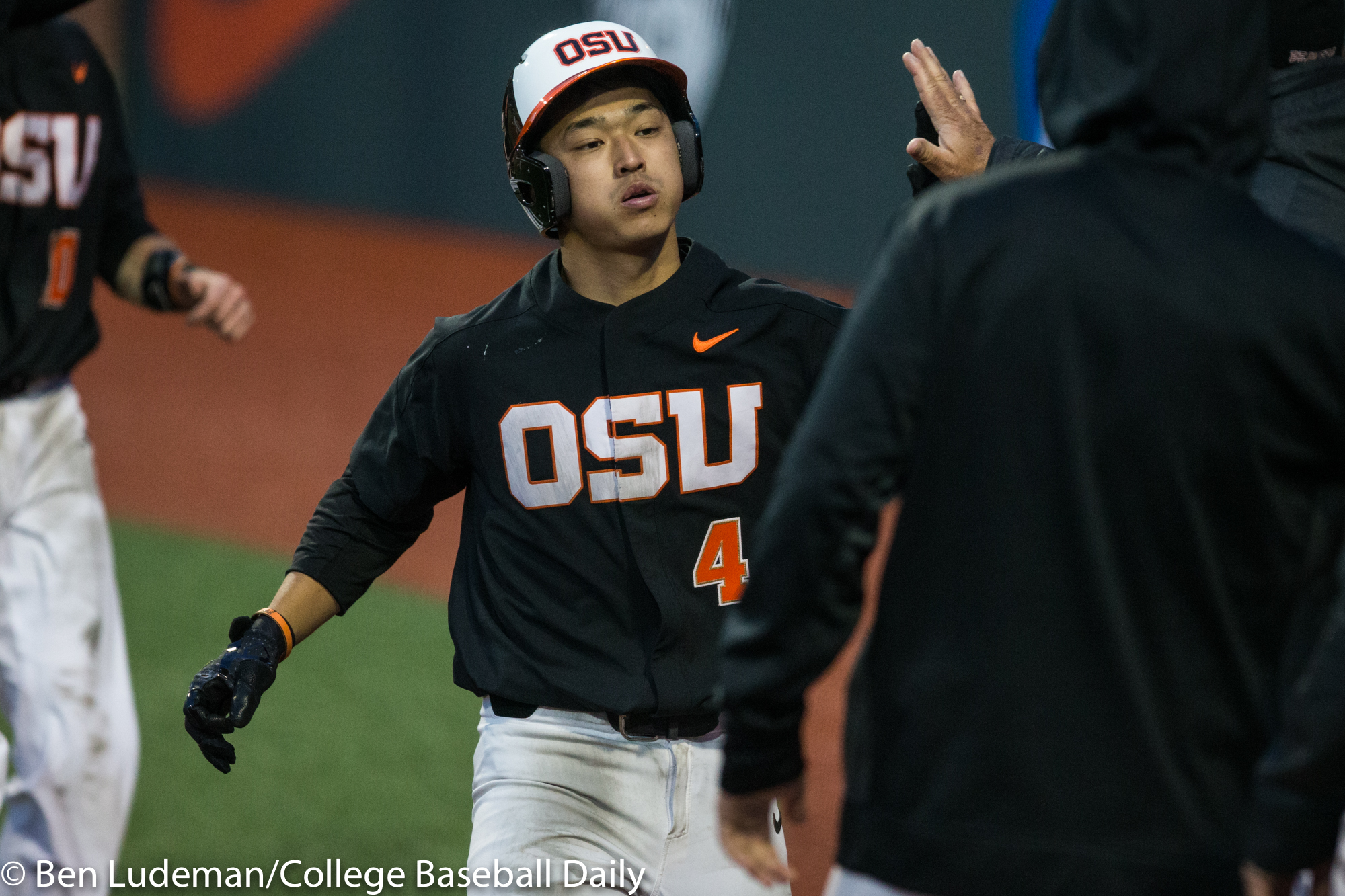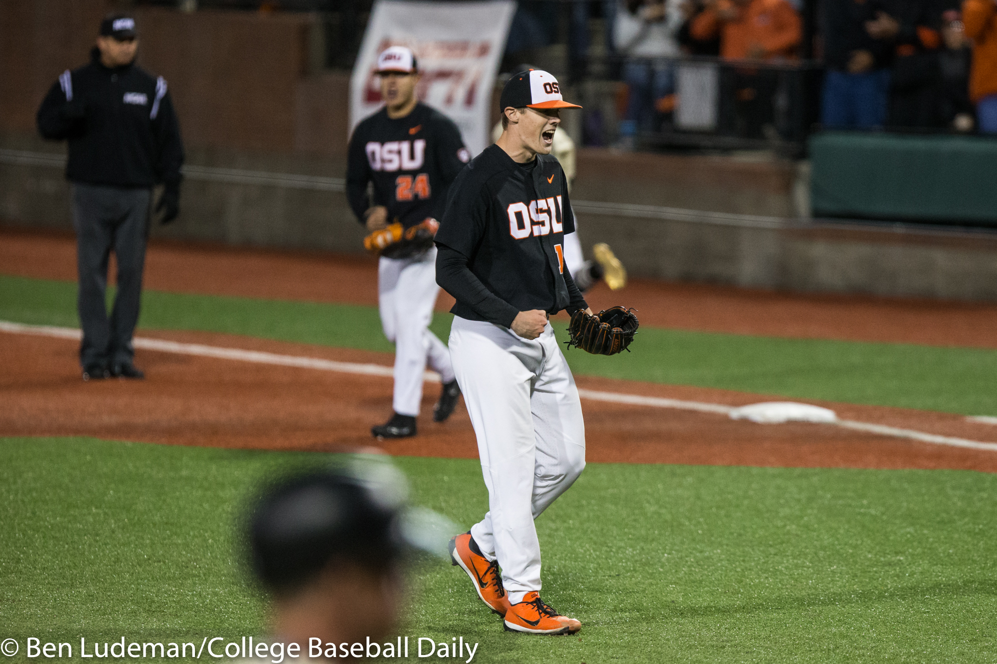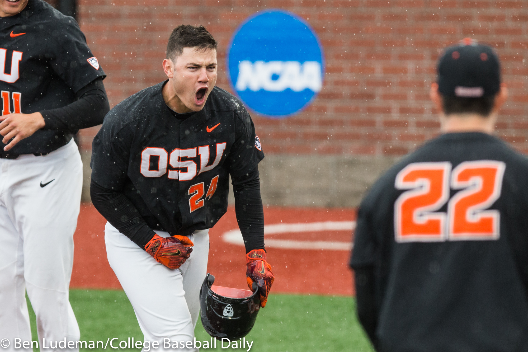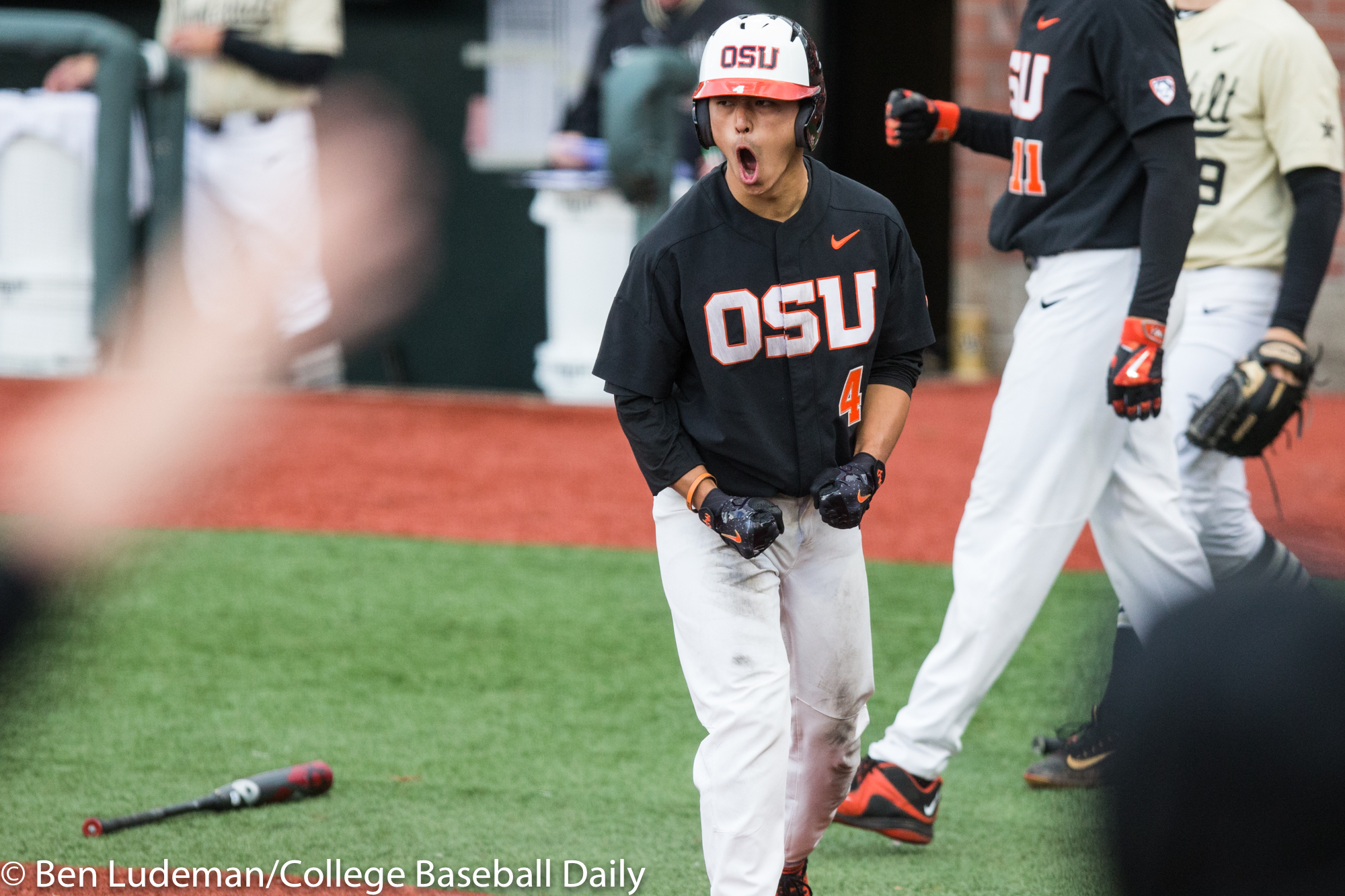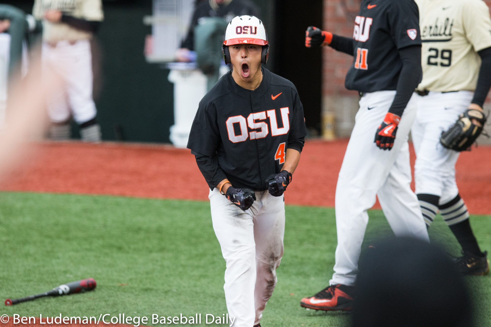 Corvallis, OR – JUNE 9: KJ Harrison (24) of the Oregon State Beavers celebrates a homerun during an 8-4 Oregon State Beavers victory over the Vanderbilt Commodores in an NCAA Championship Super Regional Playoff game on June 9, 2017 at Goss Stadium on the campus of Oregon State University in Corvallis, OR (Photo by Ben Ludeman)