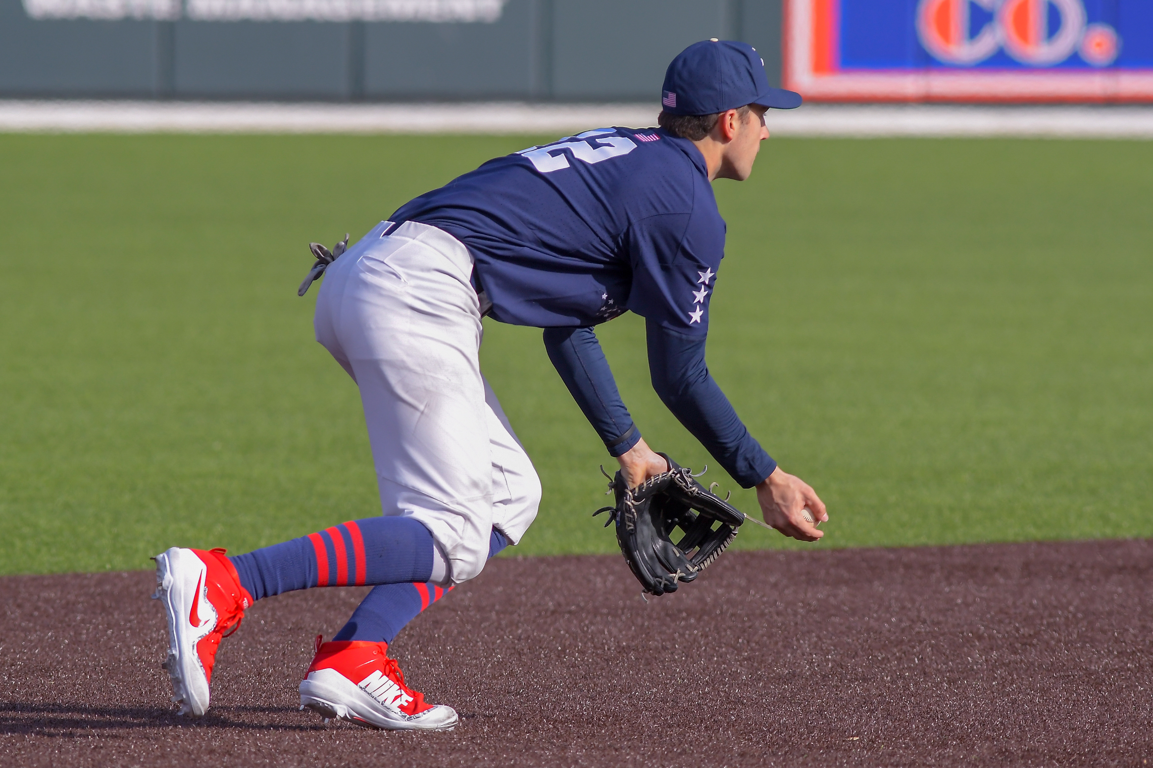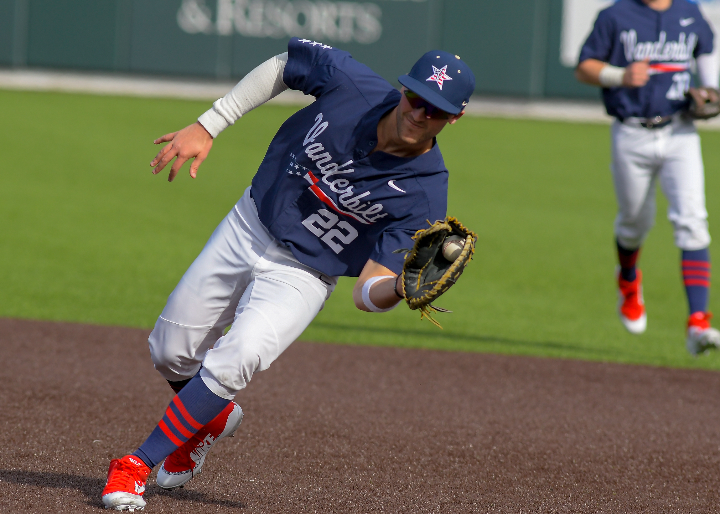 Commodore first baseman Julian Infante (22) snags a ground ball and makes the force play at first base in in game three of the opening weekend series with Duke at Hawkins field on Sunday afternoon in Nashville, TN.