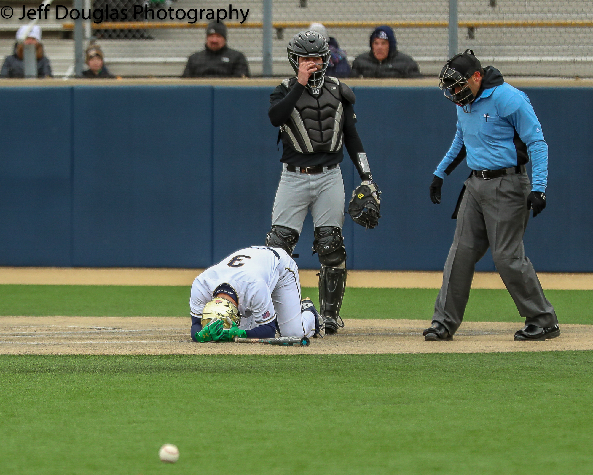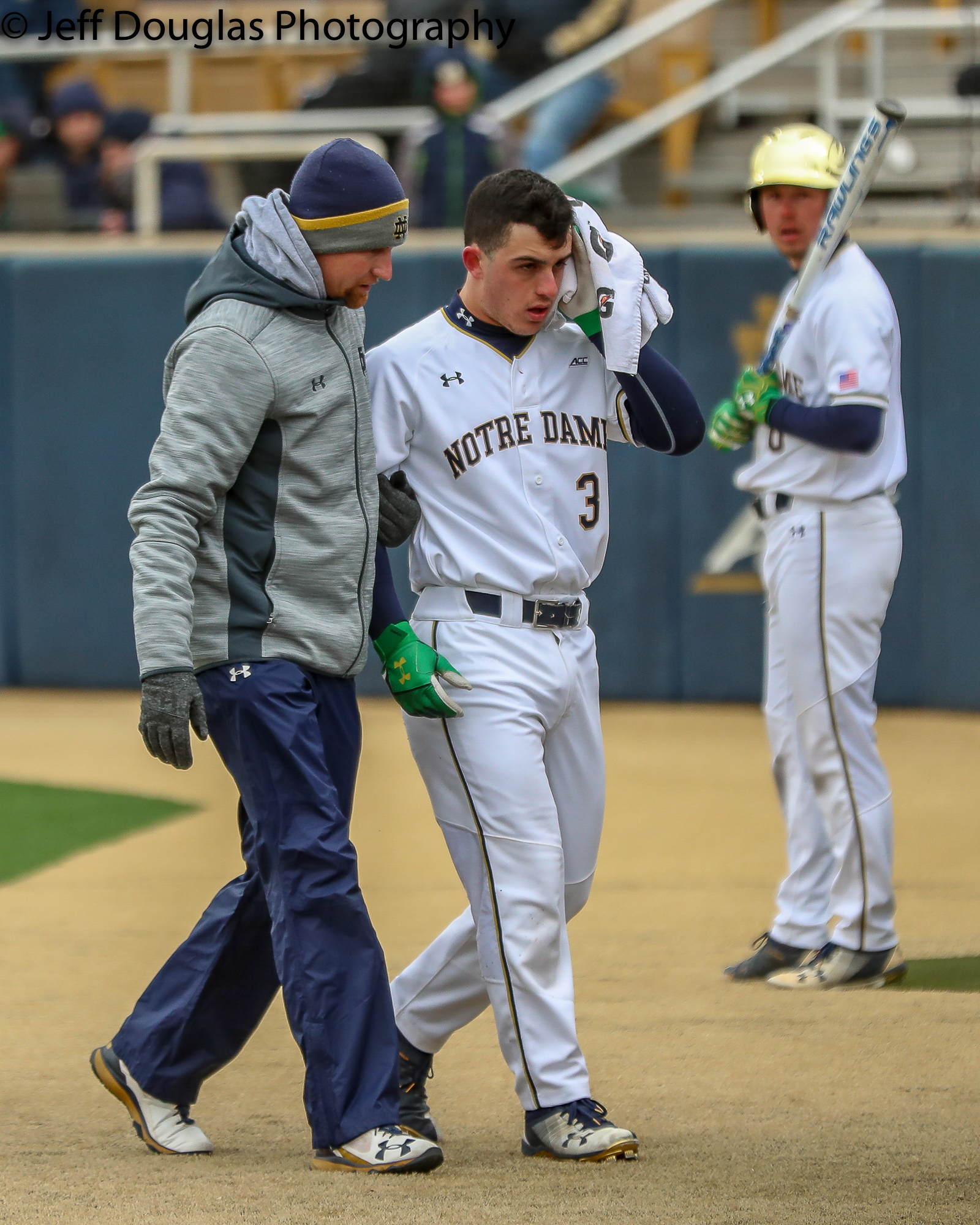 Notre Dame catcher David LaManna (3) is escorted to the dugout after being beaned by Wake Forest pitcher Morgan McSweeney (35) March 24, 2018; South Bend, Indiana, United States; during a ACC conference matchup between Wake Forest and Notre Dame at Frank Eck Stadium. Photo: © Jeff Douglas for College Baseball Daily.