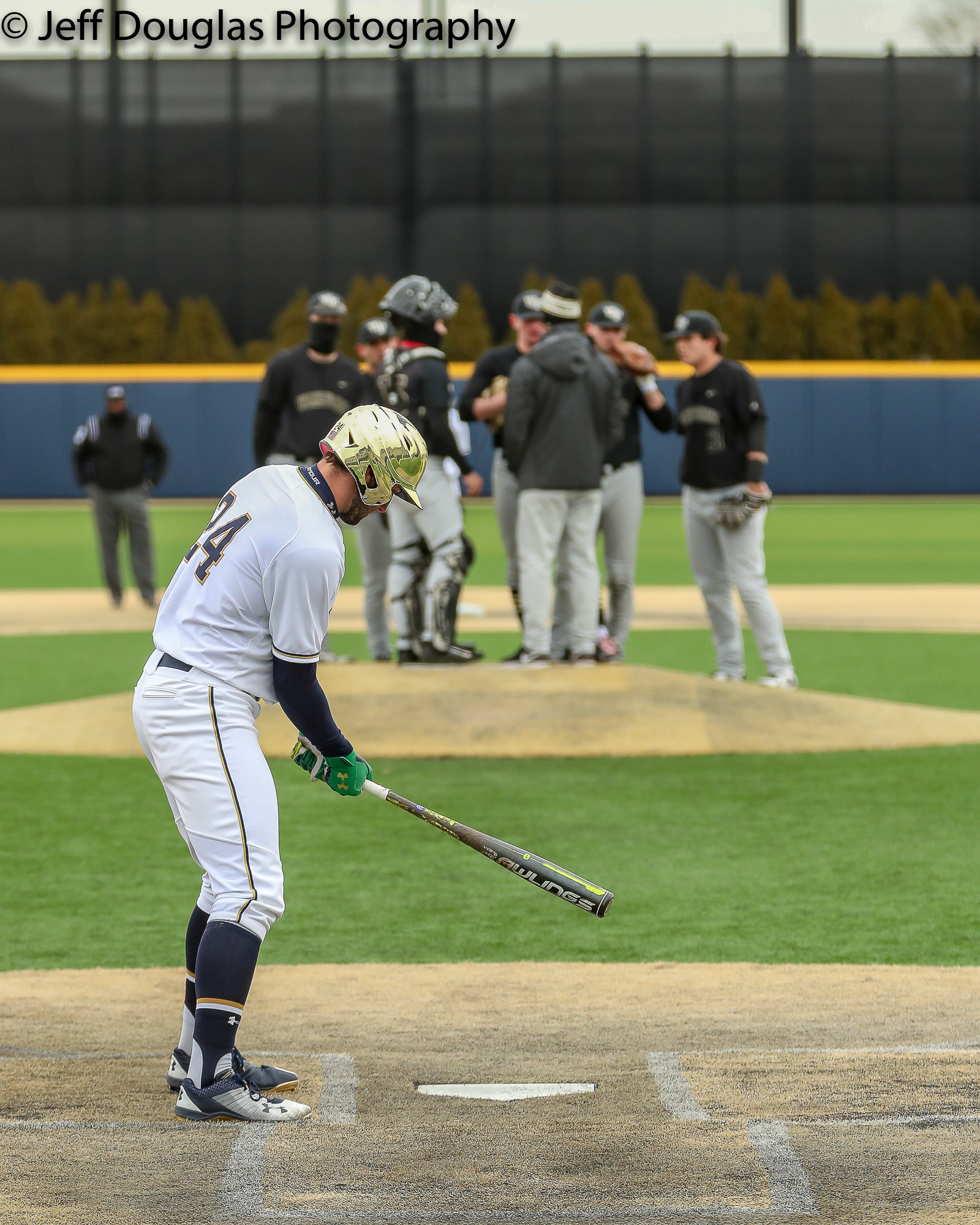 Notre Dame outfielder Matt Vierling (24) visualizes his plate appearance during a visit to the mounds by the Wake Forest Head Coach March 24, 2018; South Bend, Indiana, United States; during a ACC conference matchup between Wake Forest and Notre Dame at Frank Eck Stadium. Photo: © Jeff Douglas for College Baseball Daily.