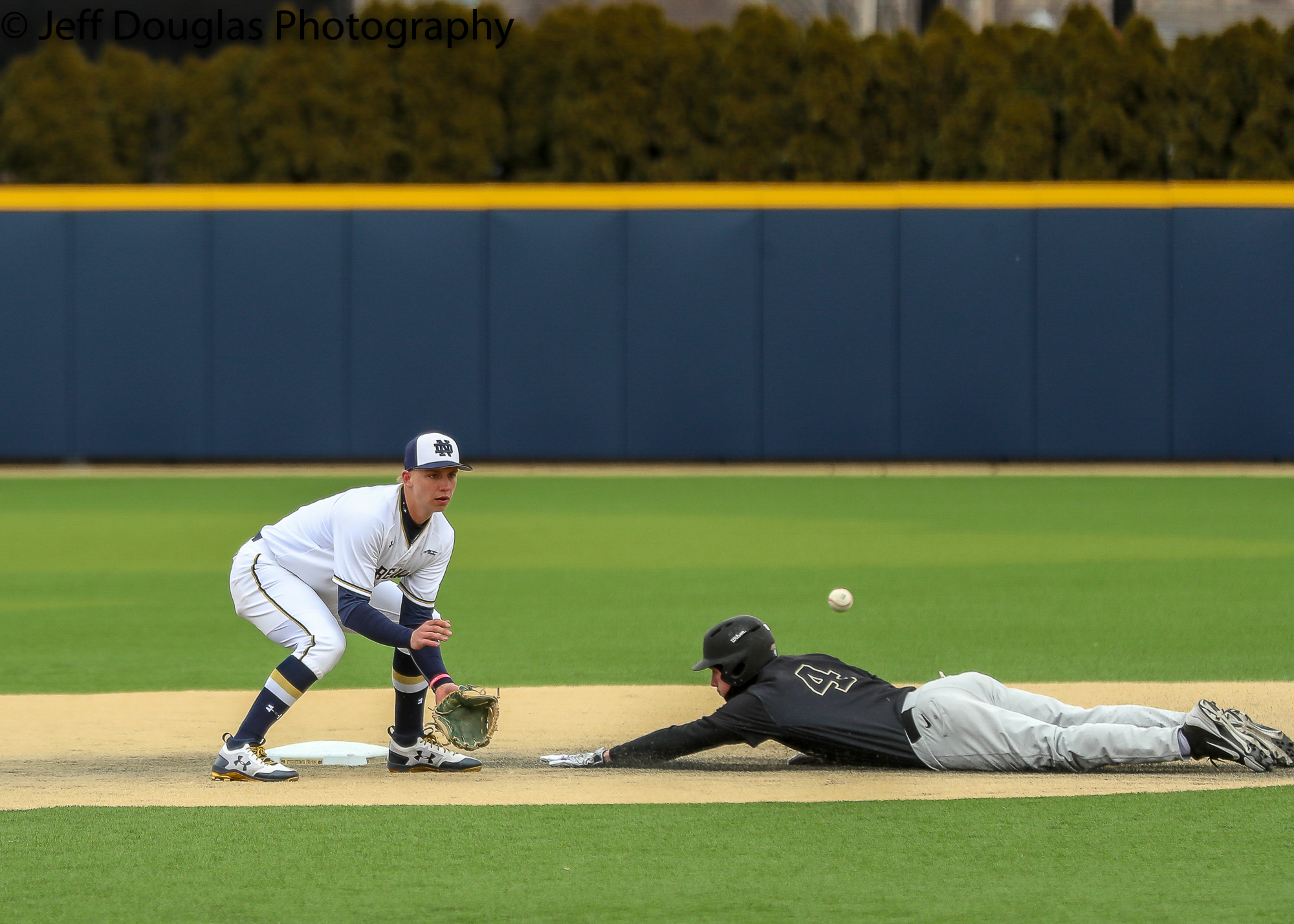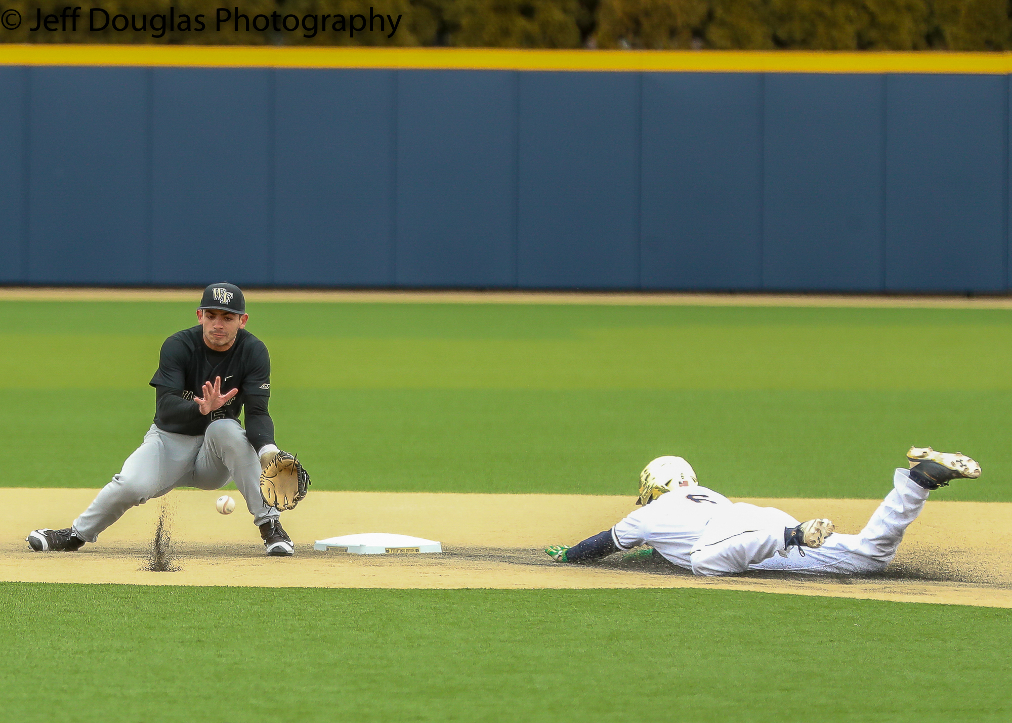 Wake Forest outfielder DJ Poteet (4) steals second base March 24, 2018; South Bend, Indiana, United States; during a ACC conference matchup between Wake Forest and Notre Dame at Frank Eck Stadium. Photo: © Jeff Douglas for College Baseball Daily.