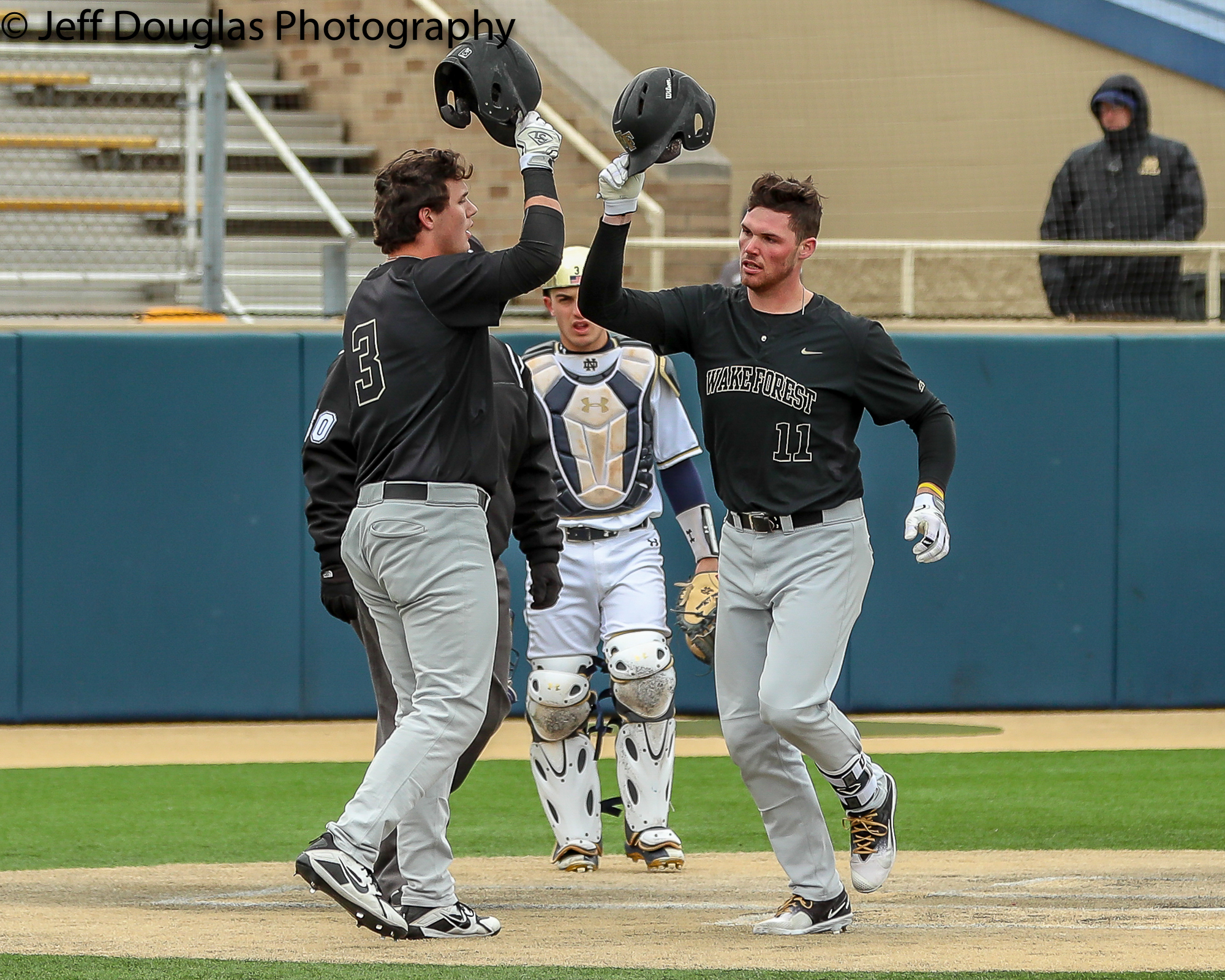 Wake Forest DH Shane Muntz (11) is congratulated by Wake Forest 1st Baseman Bobby Seymour (3) after hitting a 2 run homer in the 4th inning March 24, 2018; South Bend, Indiana, United States; during a ACC conference matchup between Wake Forest and Notre Dame at Frank Eck Stadium. Photo: © Jeff Douglas for College Baseball Daily.