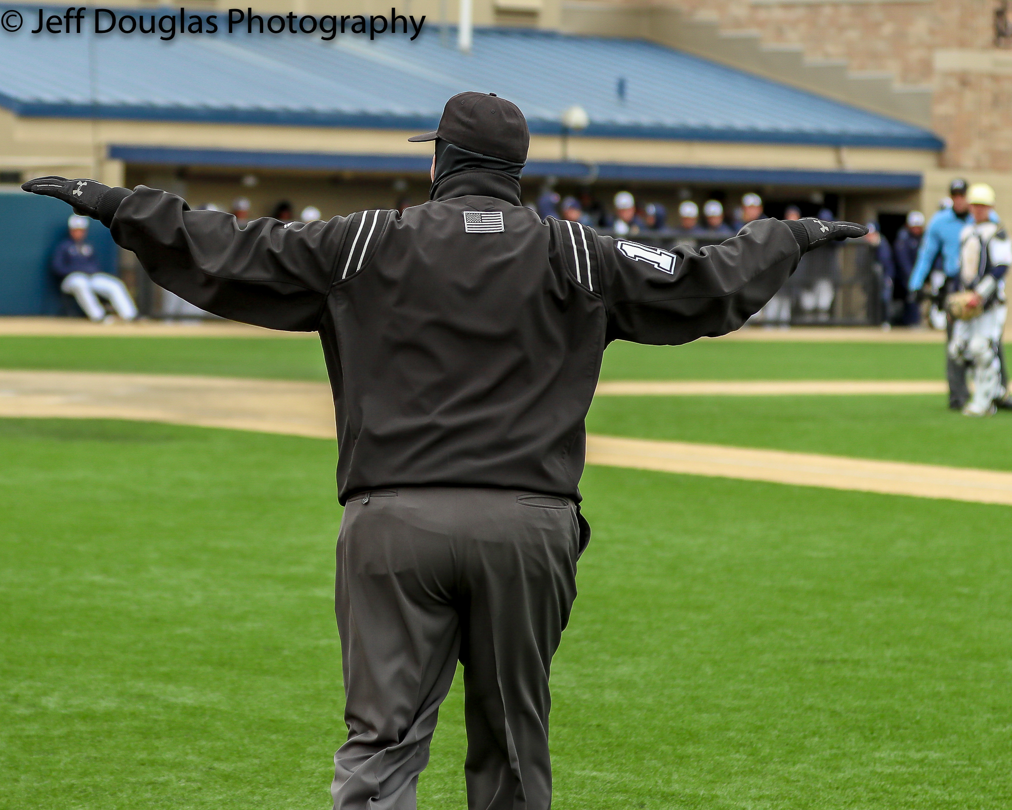 An umpire signals safe after reviewing a challenge by the Notre Dame head coach. The play was ruled safe on the field as well March 24, 2018; South Bend, Indiana, United States; during a ACC conference matchup between Wake Forest and Notre Dame at Frank Eck Stadium. Photo: © Jeff Douglas for College Baseball Daily.