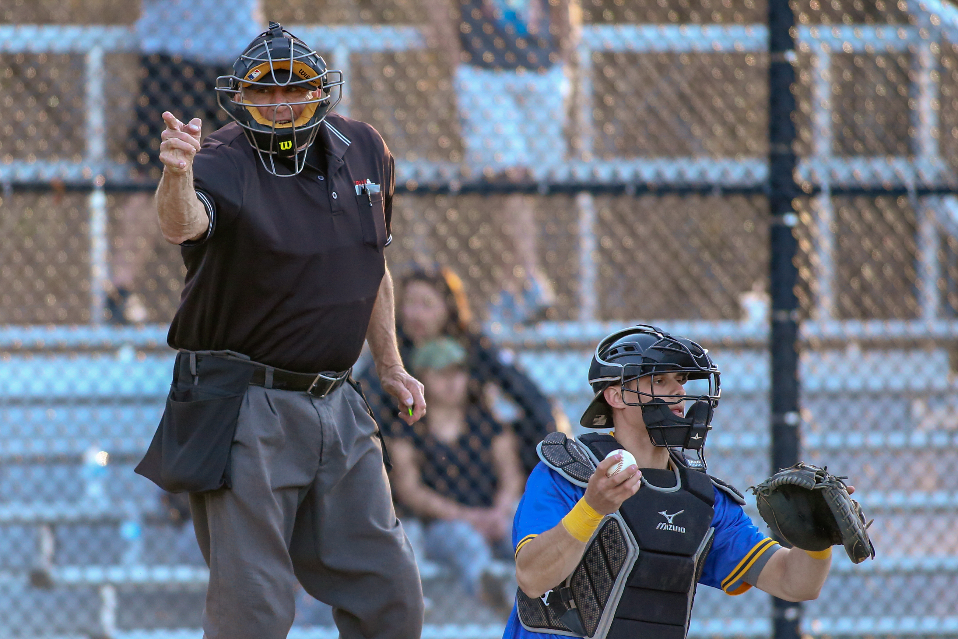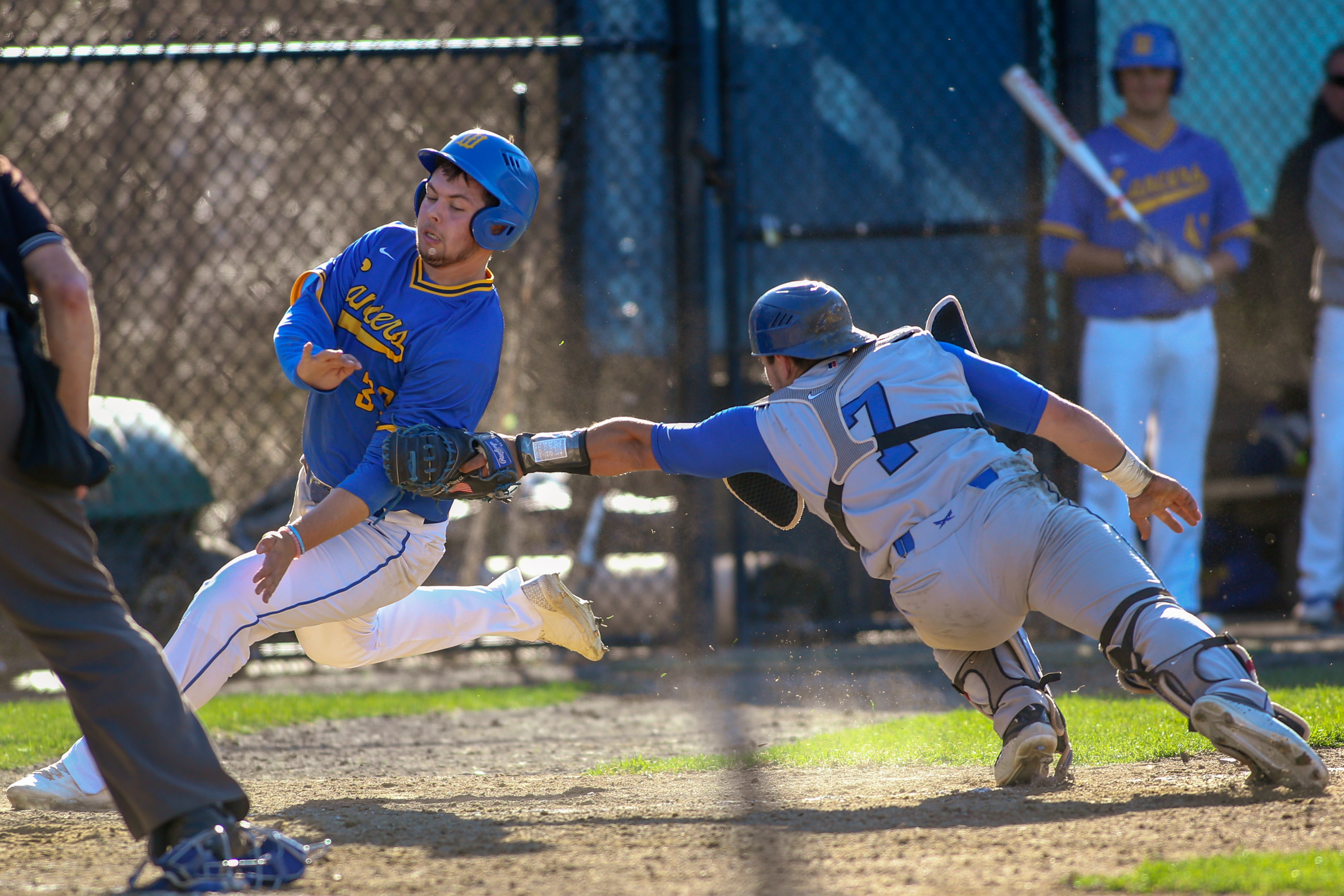 April 23,2018; Worcester, Massachusetts, United States; Becker College Hawks catcher Cameron Plank (7) Worcester State Lancers outfielder William Roberge (33) during a nonconfernece matchup between Becker College and Worcester State at Kevin D. Lyons Diamond. Photo: © Brian Foley for Foley-Photography.com.
