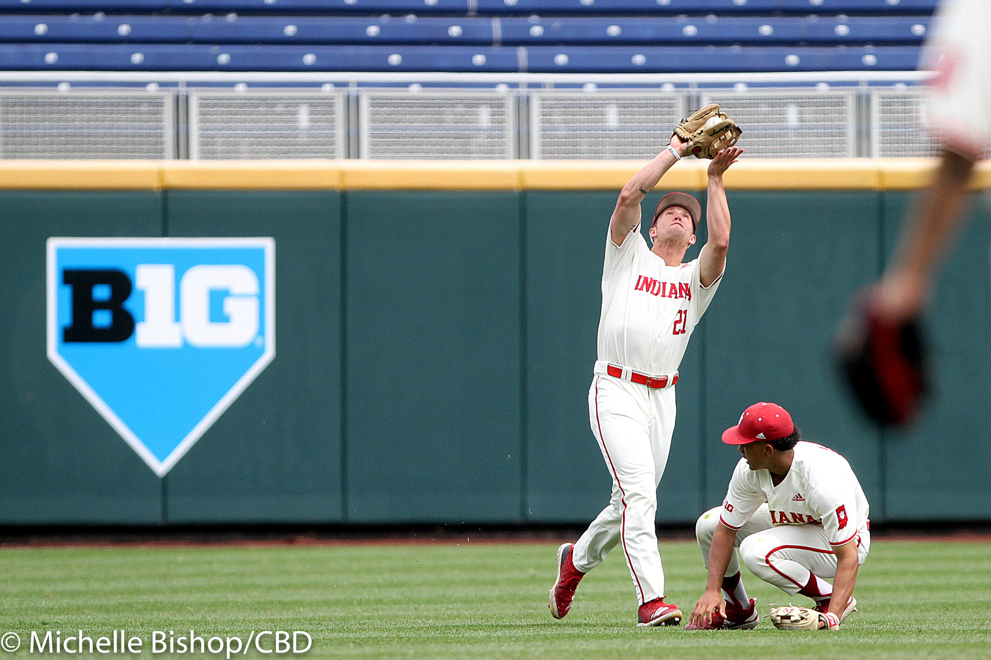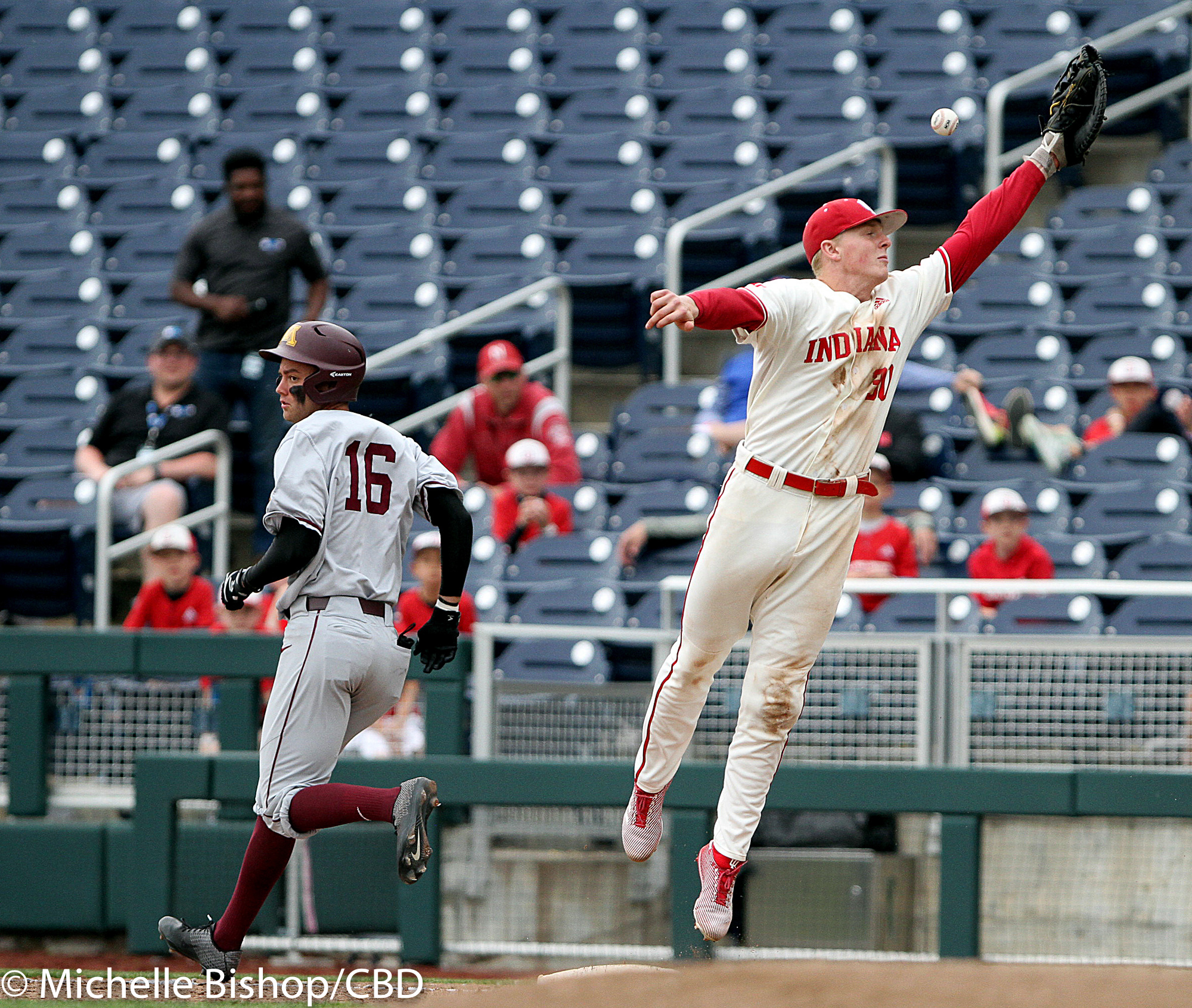 Indiana’s Scotty Bradley leaps to reach a wide throw to first during the eighth inning of day two’s elimination game at the Big Ten Baseball Tournament in Omaha, Neb. Thursday, May 23, 2019. Minnesota’s Easton Bertrand (16) was safe on the play and advanced to second on the overthrow. Indiana lost to Minnesota 9-4. (Photo by Michelle Bishop)