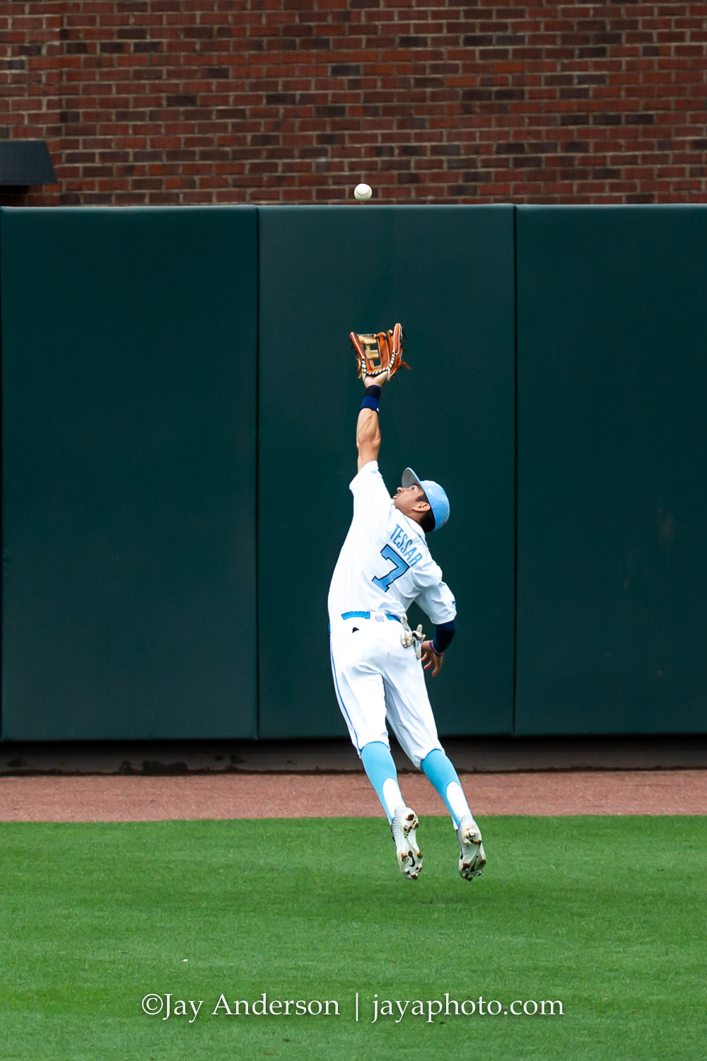 CHAPEL HILL, NC – JUNE 8: North Carolina Tar Heels right fielder Dallas Tessar (7) attempts to catch a ball hit by Auburn Tigers center fielder Kason Howell (not pictured) during the first game of NCAA Super Regional on June 8, 2019, at Boshamer Stadium in Chapel Hill, NC. (Photo by Jay Anderson/College Baseball Daily)