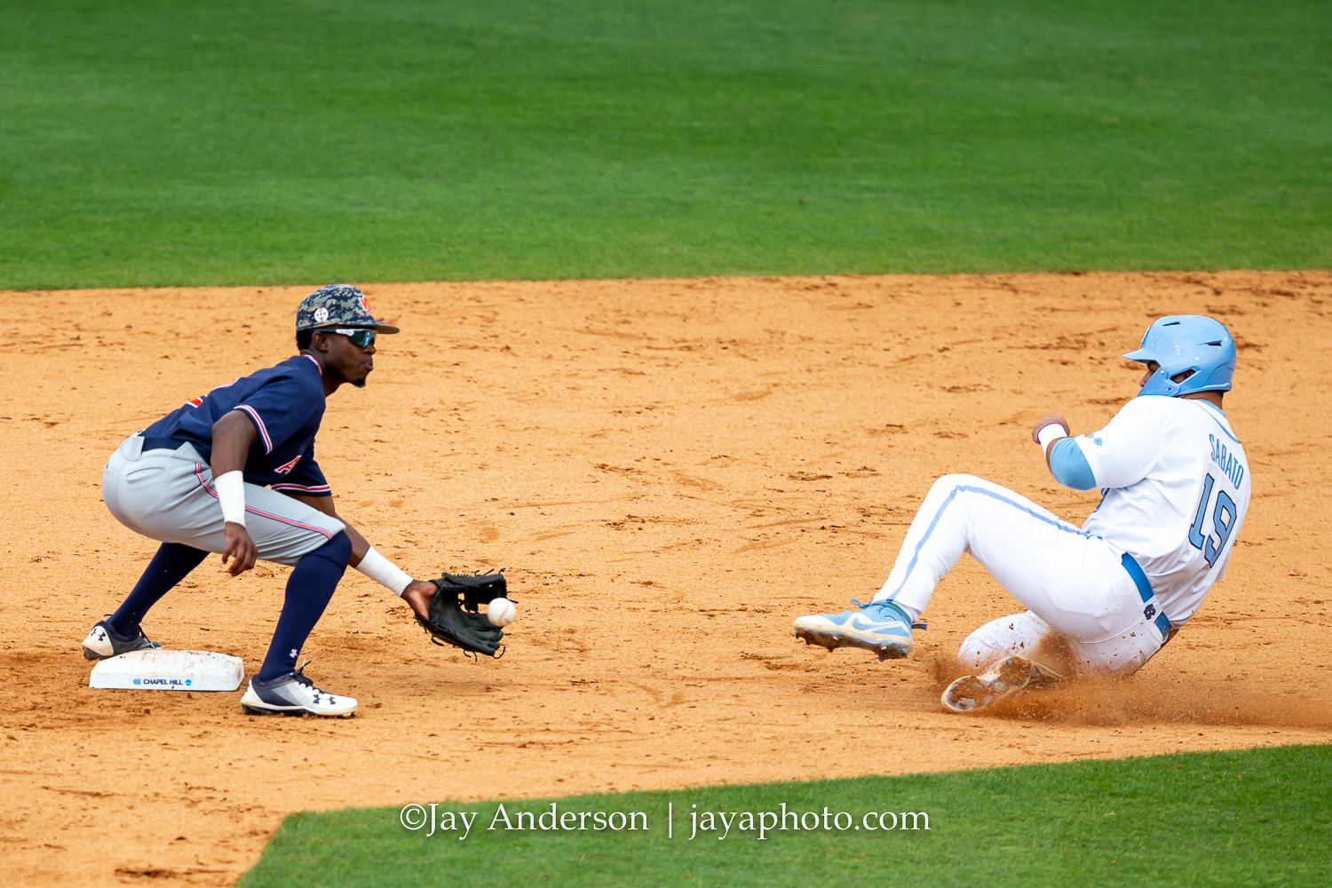 CHAPEL HILL, NC – JUNE 8: North Carolina Tar Heels first baseman Aaron Sabato (19) is caught stealing and tagged out by Auburn Tigers shortstop Will Holland (17) during the first game of NCAA Super Regional on June 8, 2019, at Boshamer Stadium in Chapel Hill, NC. (Photo by Jay Anderson/College Baseball Daily)