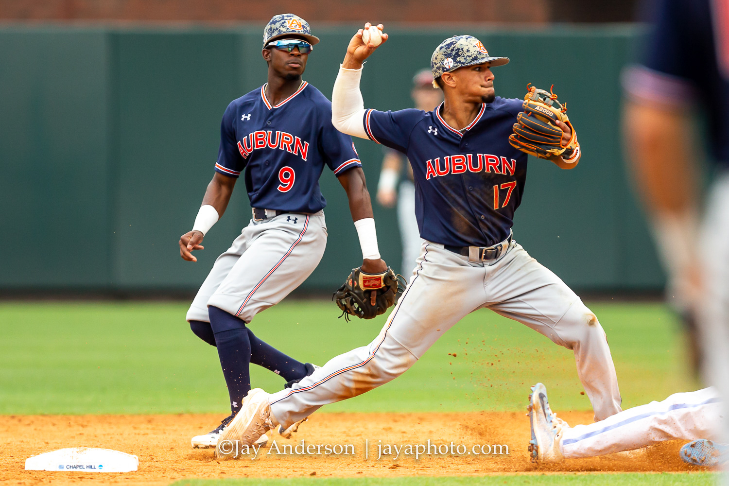 CHAPEL HILL, NC – JUNE 8: Auburn Tigers shortstop Will Holland (17) turns a double play against the North Carolina Tar Heels as second baseman Ryan Bliss (9) looks on during the first game of NCAA Super Regional on June 8, 2019, at Boshamer Stadium in Chapel Hill, NC. (Photo by Jay Anderson/College Baseball Daily)