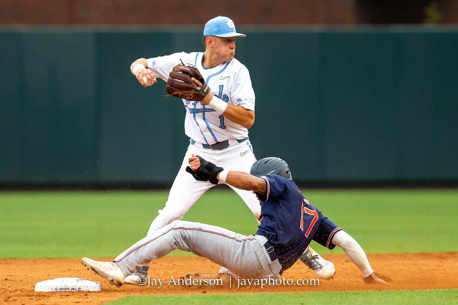 CHAPEL HILL, NC – JUNE 8: North Carolina Tar Heels shortstop Danny Serretti (1) turns a double play as Auburn Tigers shortstop Will Holland (17) tries to break it up during the first game of NCAA Super Regional on June 8, 2019, at Boshamer Stadium in Chapel Hill, NC. (Photo by Jay Anderson/College Baseball Daily)
