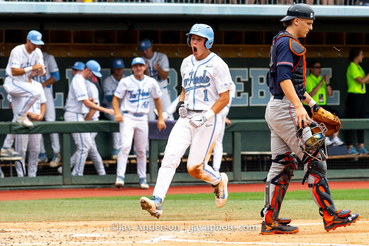 CHAPEL HILL, NC – JUNE 8: North Carolina Tar Heels shortstop Danny Serretti (1) celebrates before scoring in the first inning as Auburn Tigers catcher Matt Scheffler (6) looks on during the first game of NCAA Super Regional on June 8, 2019, at Boshamer Stadium in Chapel Hill, NC. (Photo by Jay Anderson/College Baseball Daily)