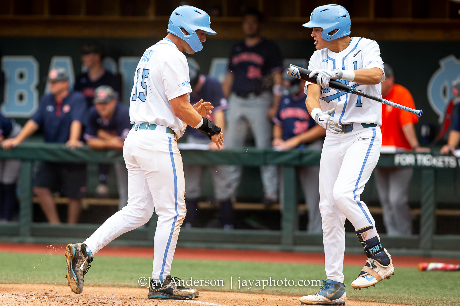 CHAPEL HILL, NC – JUNE 8: North Carolina Tar Heels first baseman Michael Busch (15) and shortstop Danny Serretti (1) celebrate after scoring against the Auburn Tigers during the first game of NCAA Super Regional on June 8, 2019, at Boshamer Stadium in Chapel Hill, NC. (Photo by Jay Anderson/College Baseball Daily)