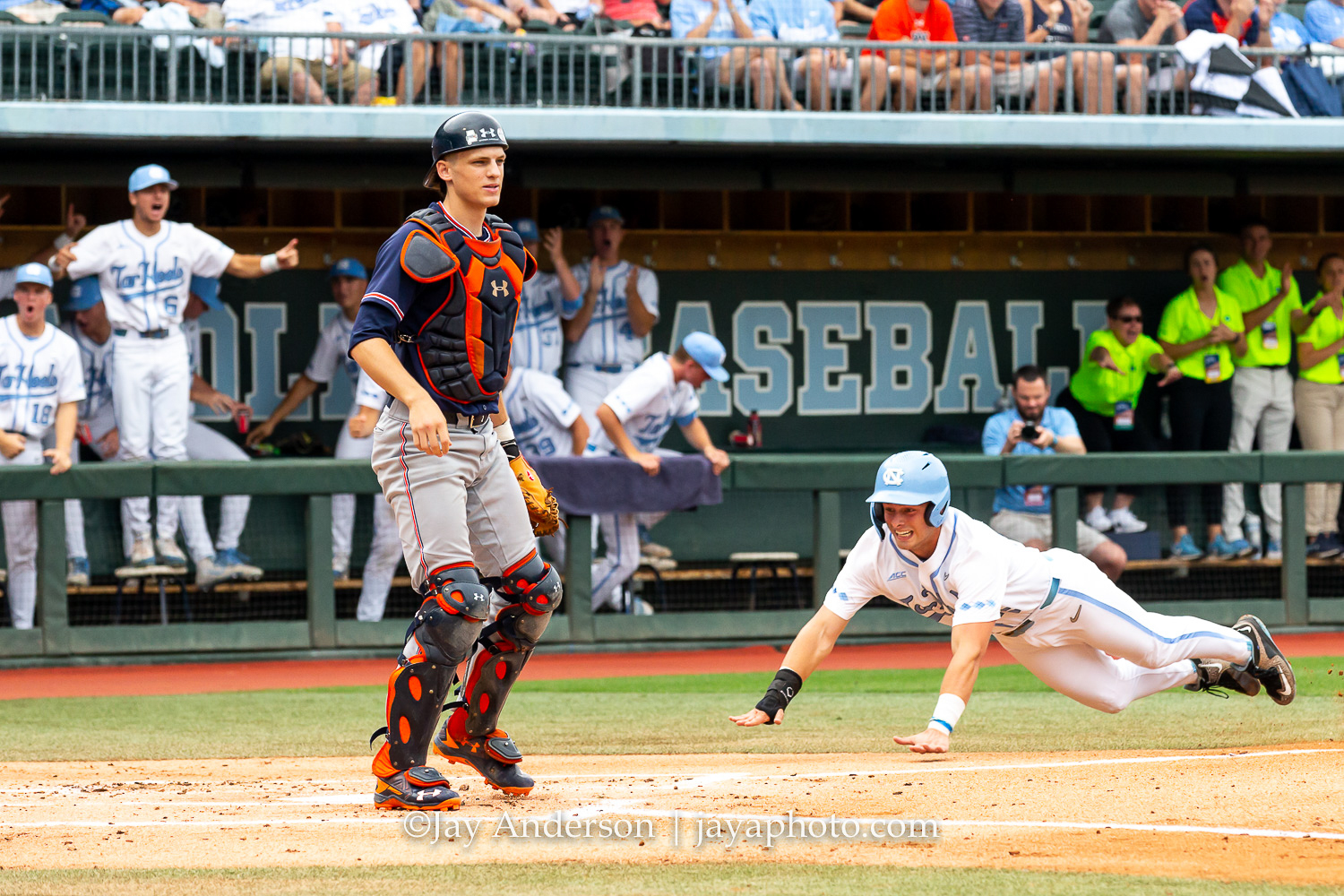 CHAPEL HILL, NC – JUNE 8: North Carolina Tar Heels first baseman Michael Busch (15) slides in to score the first run of the game as Auburn Tigers catcher Matt Scheffler (6) looks on during the first game of NCAA Super Regional on June 8, 2019, at Boshamer Stadium in Chapel Hill, NC. (Photo by Jay Anderson/College Baseball Daily)