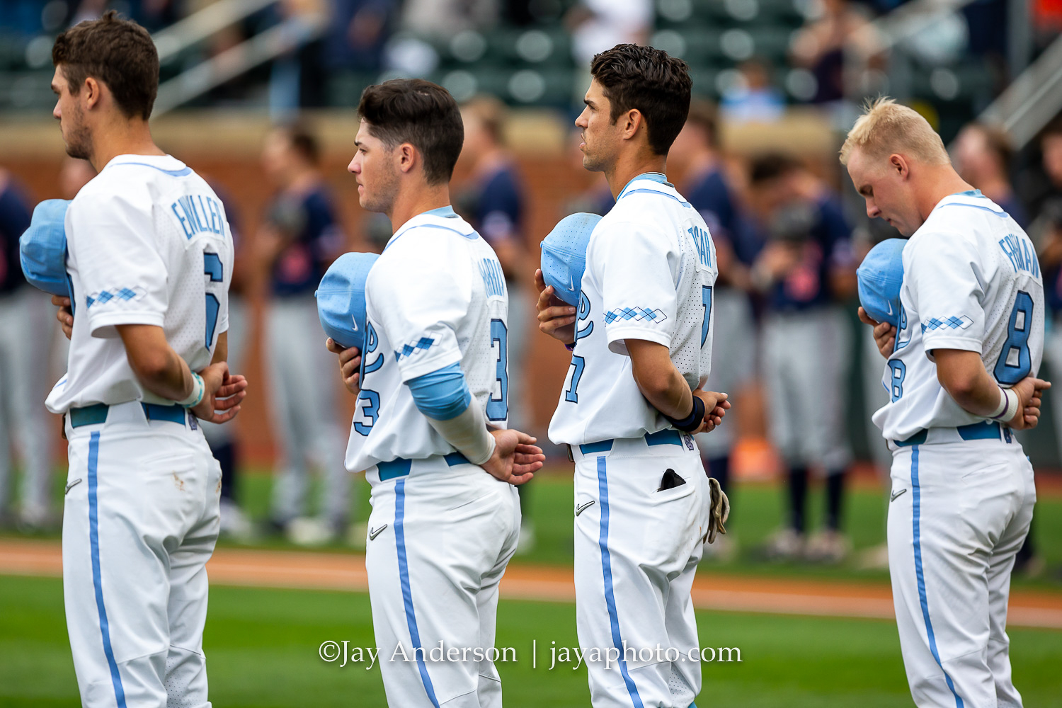 CHAPEL HILL, NC – JUNE 8: North Carolina Tar Heels Dylan Enwiller, Dylan Harris, Dallas Tessar, and Ike Freeman (L-R) listen to the national anthem before the first game of NCAA Super Regional against the Auburn Tigers on June 8, 2019, at Boshamer Stadium in Chapel Hill, NC. (Photo by Jay Anderson/College Baseball Daily)
