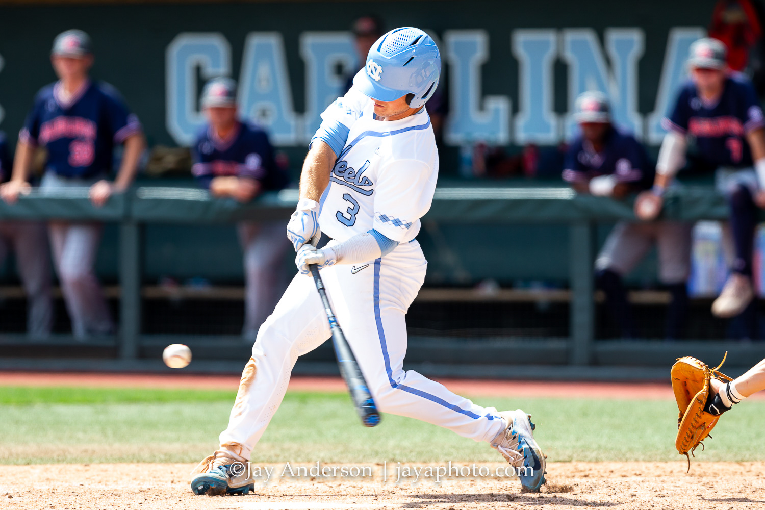 CHAPEL HILL, NC – JUNE 8: North Carolina Tar Heels outfielder Dylan Harris (3) lines out against the Auburn Tigers during the first game of NCAA Super Regional on June 8, 2019, at Boshamer Stadium in Chapel Hill, NC. (Photo by Jay Anderson/College Baseball Daily)